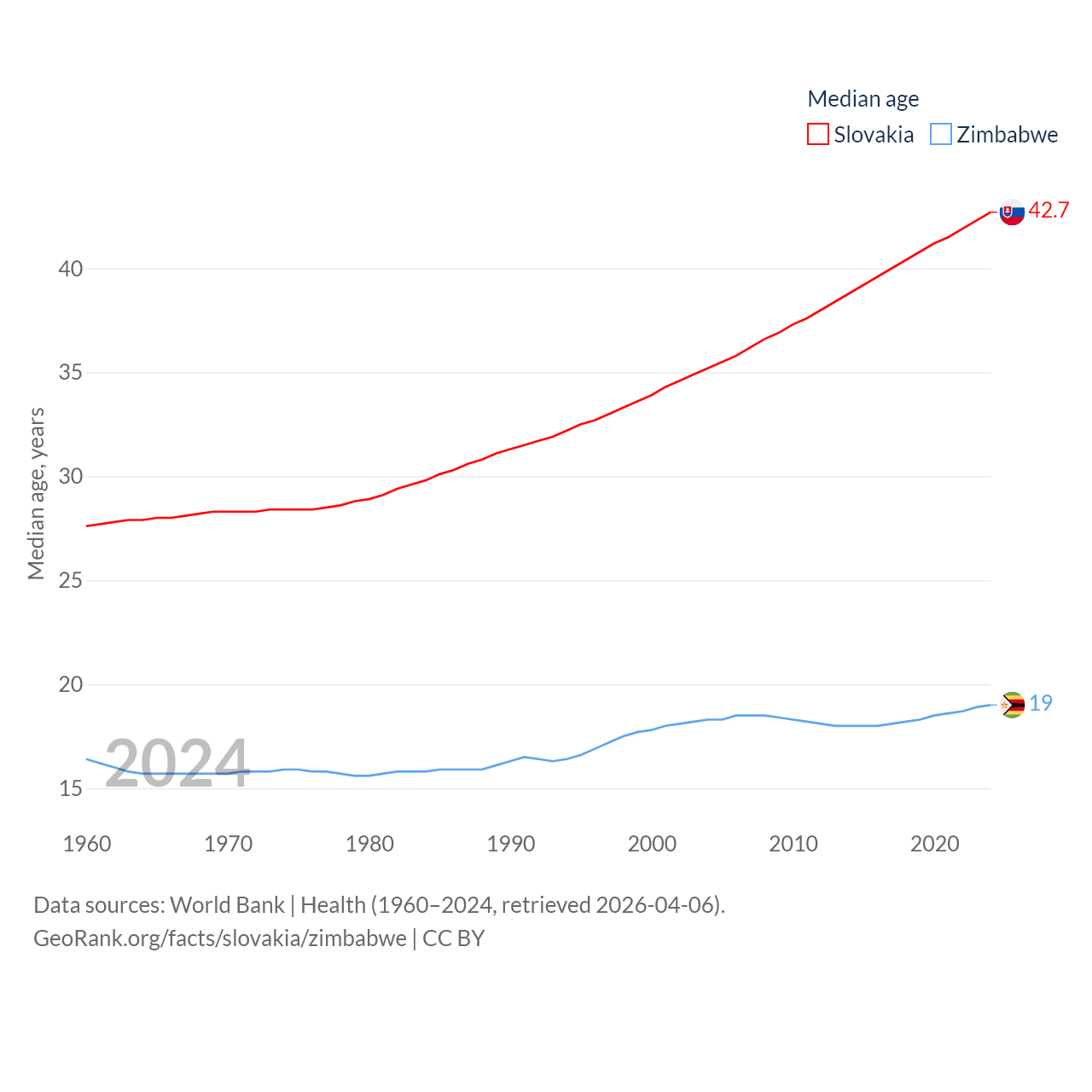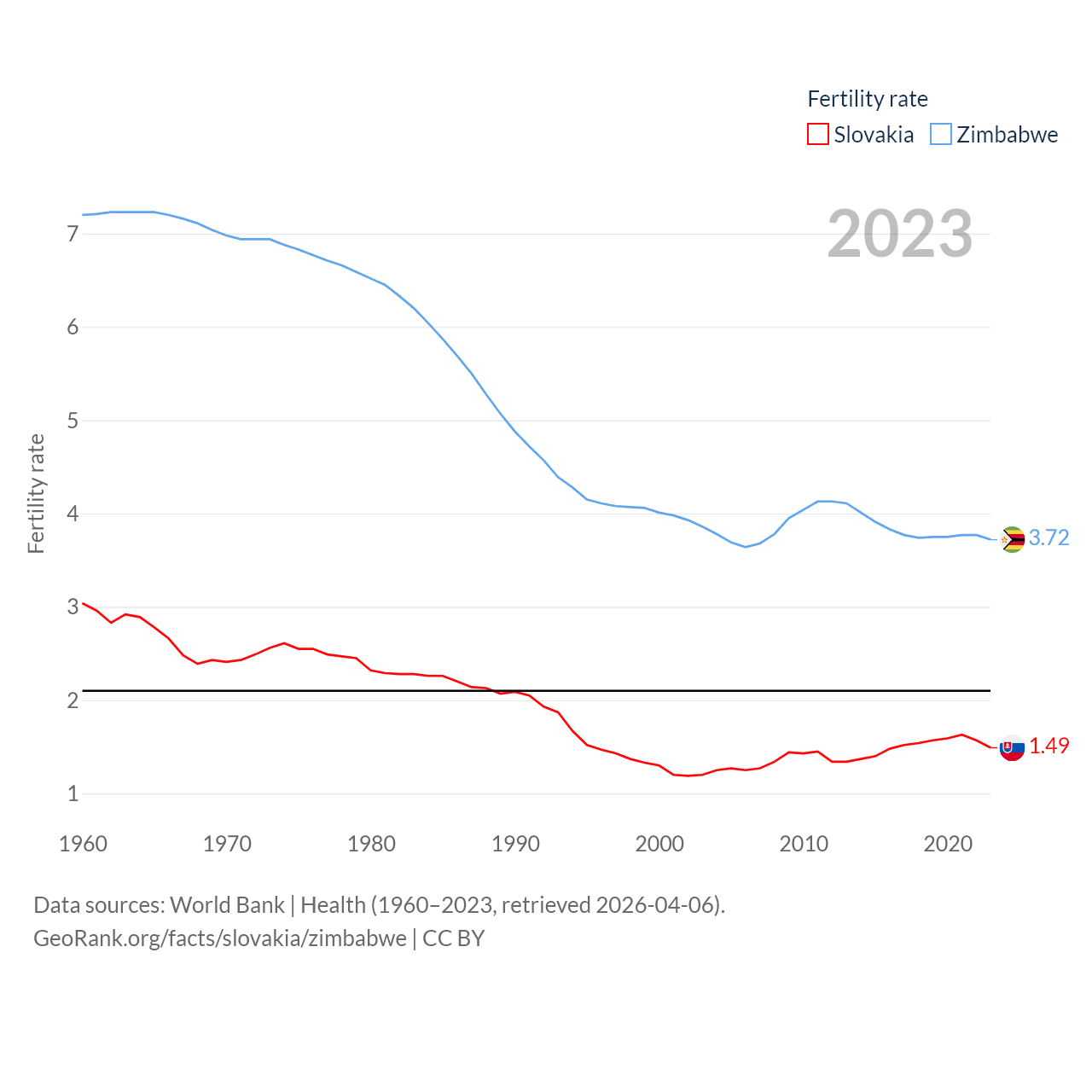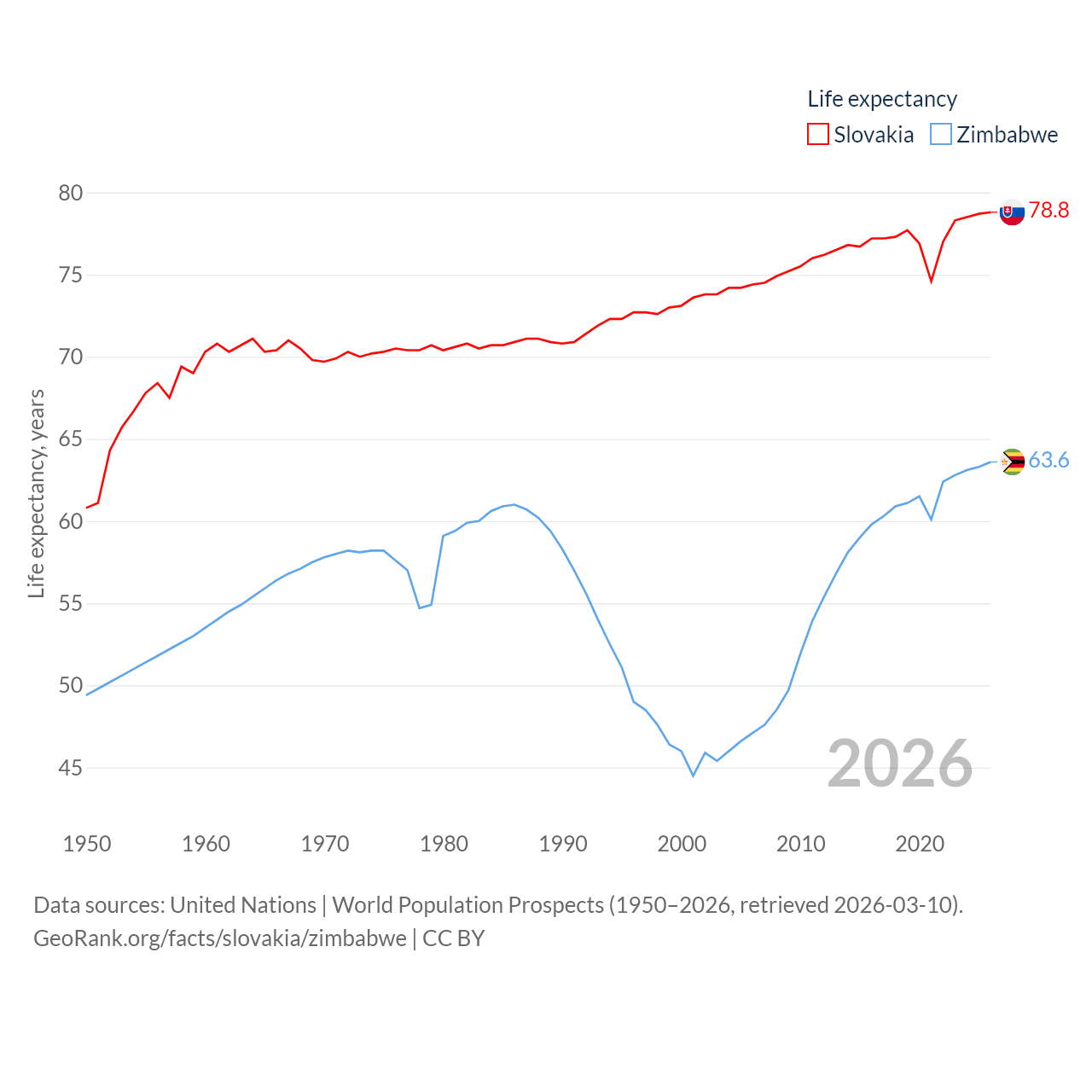 Slovakia has a population of 5.42M (ranked 119/197), compared with 16.6M in Zimbabwe (ranked 74/197). Slovakia's land area is 18,564 sq mi versus 149,364 sq mi for Zimbabwe (ranked 128th vs. 60th).