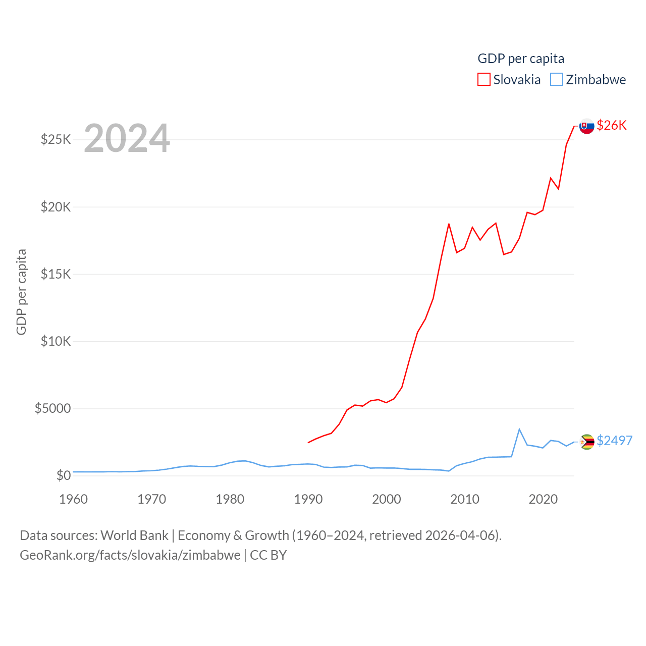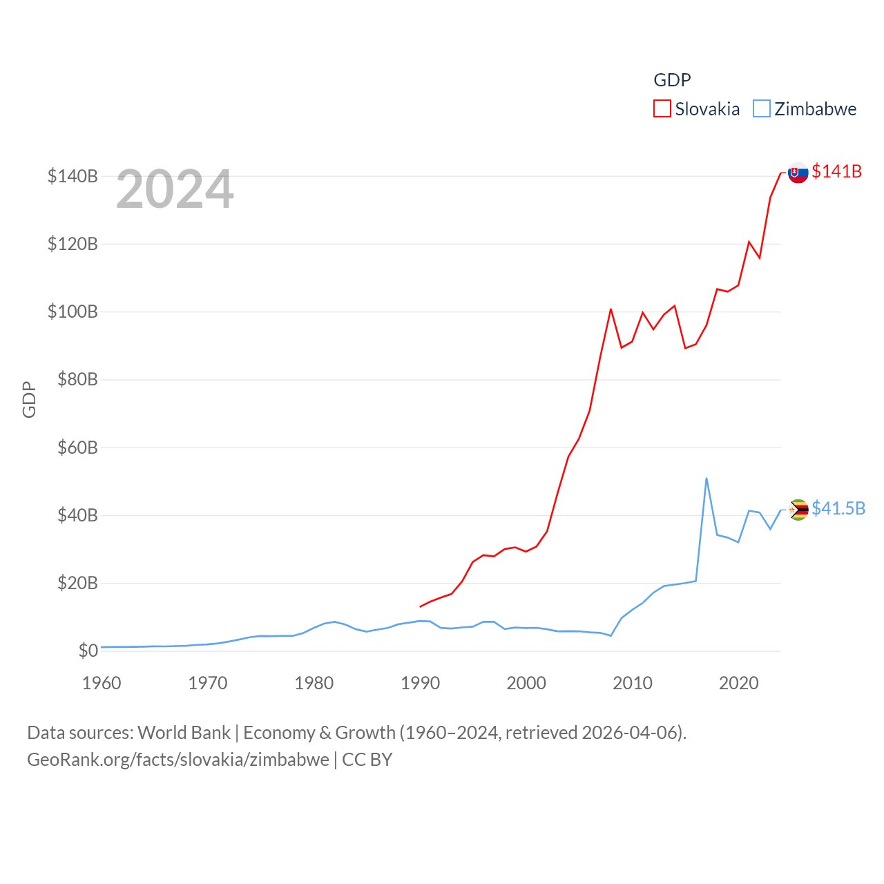 By GDP, Slovakia ranks 61/197 ($141B) and Zimbabwe ranks 102/197 ($41.5B). By GDP per capita, Slovakia ranks 47/197 ($25,993), while Zimbabwe ranks 148/197 ($2,497).