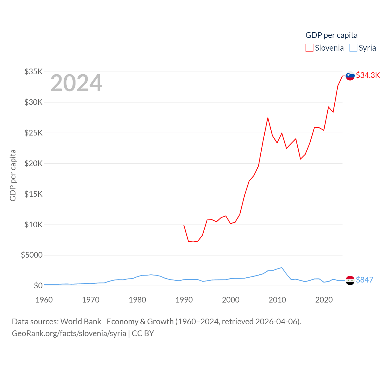 By GDP, Slovenia ranks 86/197 ($73B) and Syria ranks 129/197 ($20B). By GDP per capita, Slovenia ranks 34/197 ($34,301), while Syria ranks 185/197 ($847).