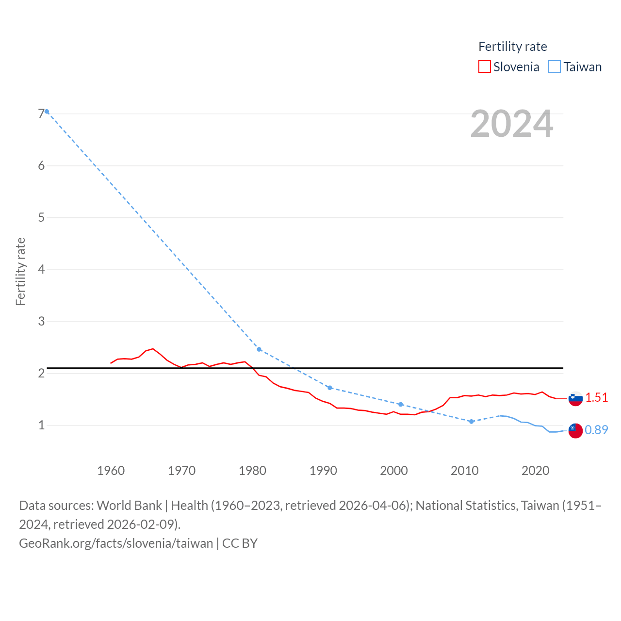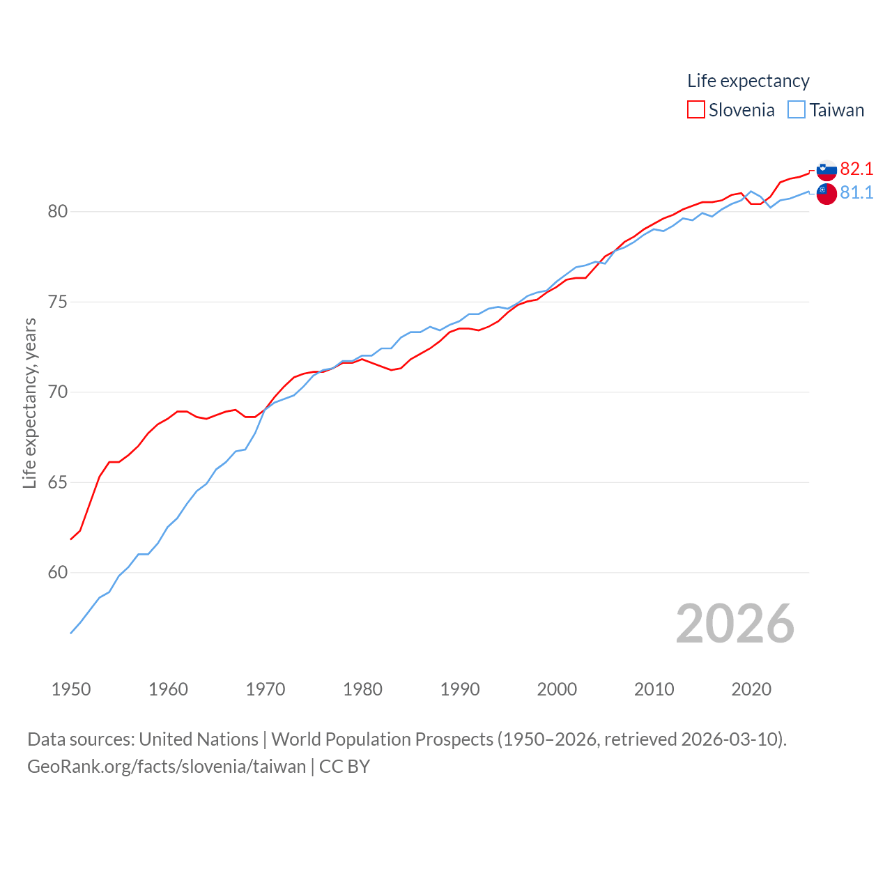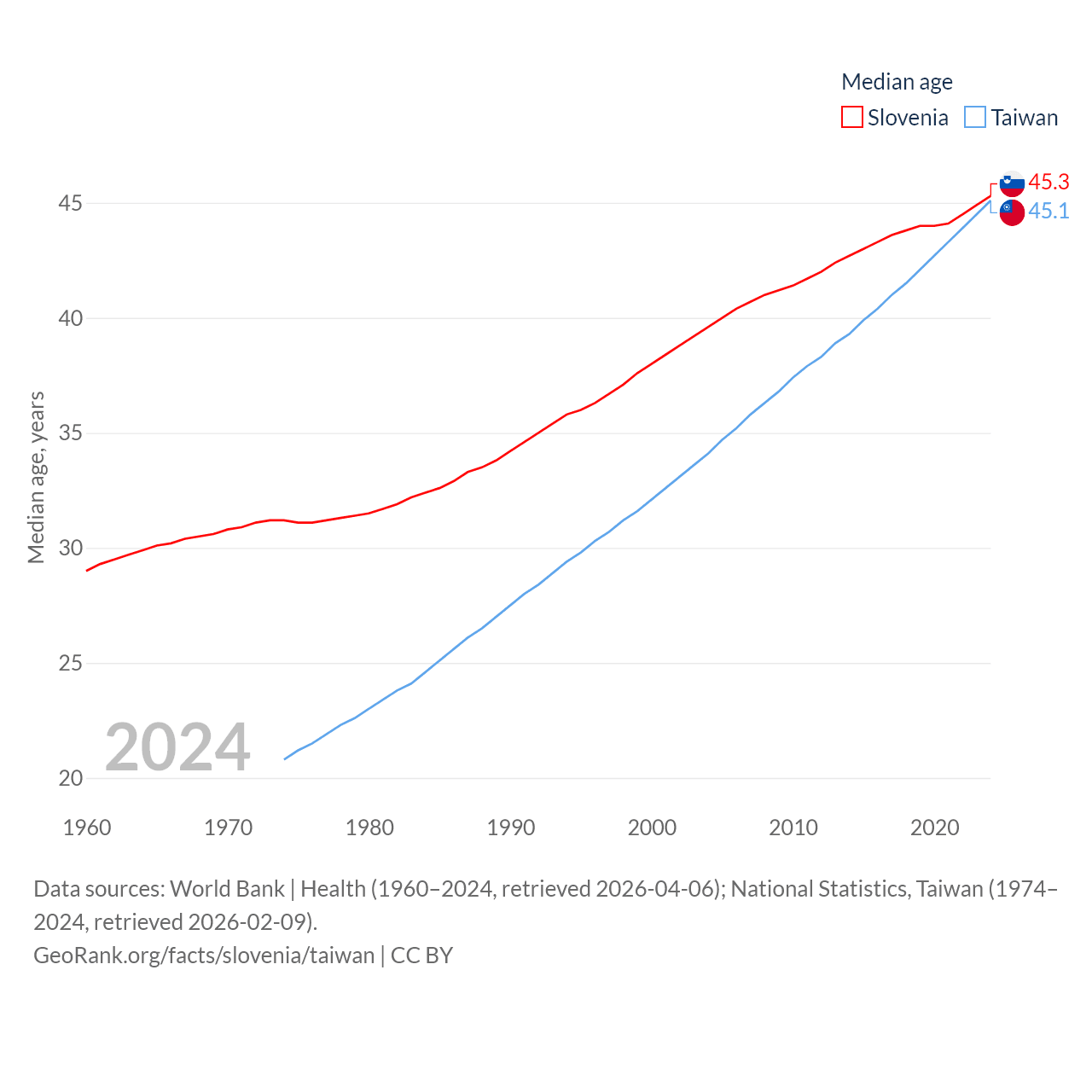 Slovenia has a population of 2.13M (ranked 147/197), compared with 23.3M in Taiwan (ranked 60/197). Slovenia's land area is 7,774 sq mi versus 13,976 sq mi for Taiwan (ranked 151st vs. 133rd).