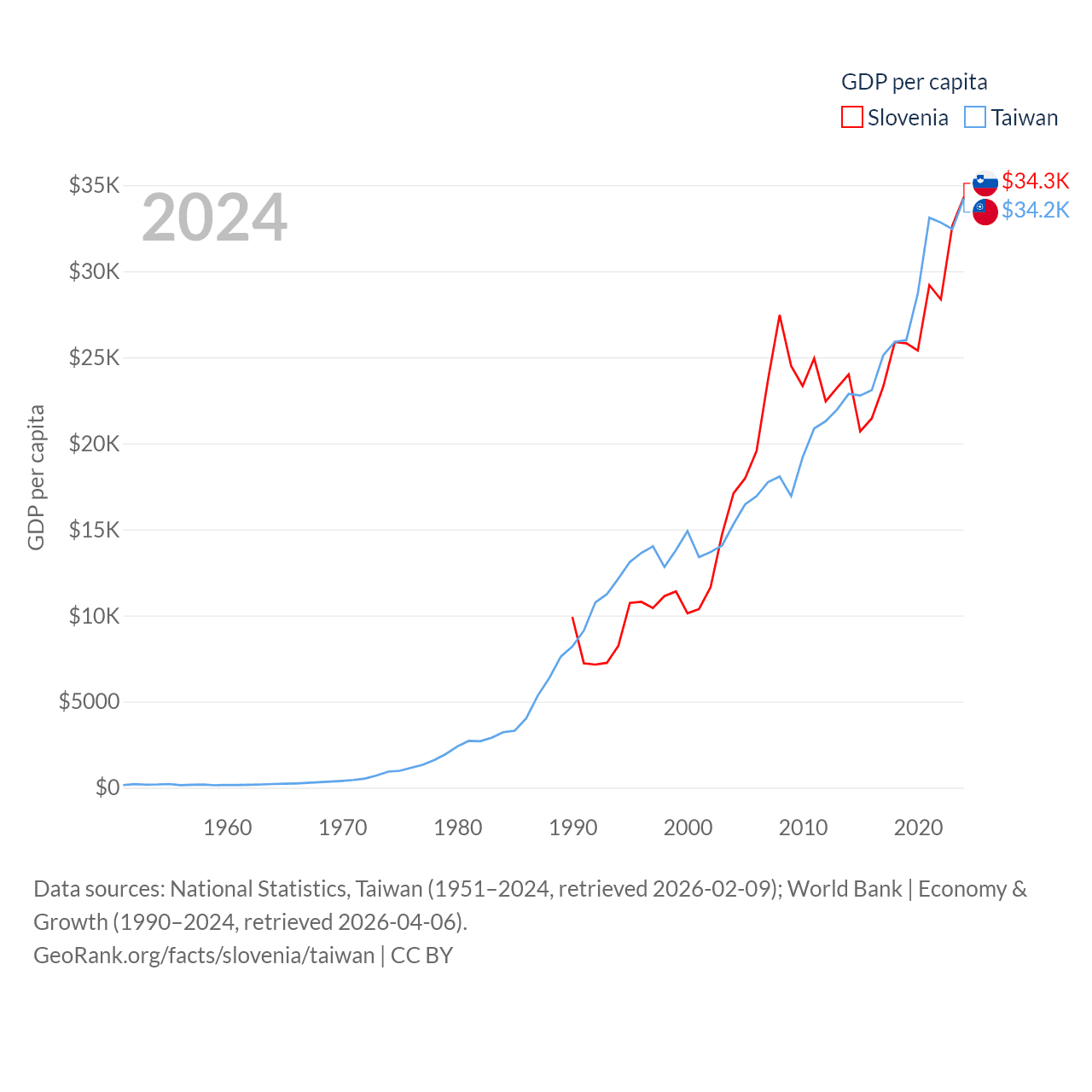 By GDP, Slovenia ranks 86/197 ($73B) and Taiwan ranks 22/197 ($802B). By GDP per capita, Slovenia ranks 34/197 ($34,301), while Taiwan ranks 35/197 ($34,238).