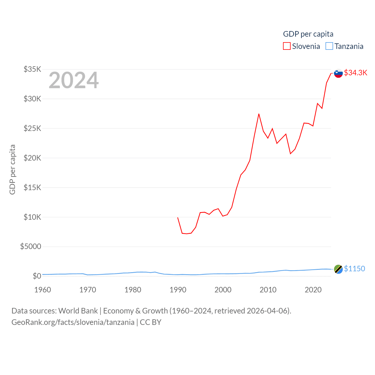 By GDP, Slovenia ranks 86/197 ($73B) and Tanzania ranks 82/197 ($78.8B). By GDP per capita, Slovenia ranks 34/197 ($34,301), while Tanzania ranks 170/197 ($1,150).