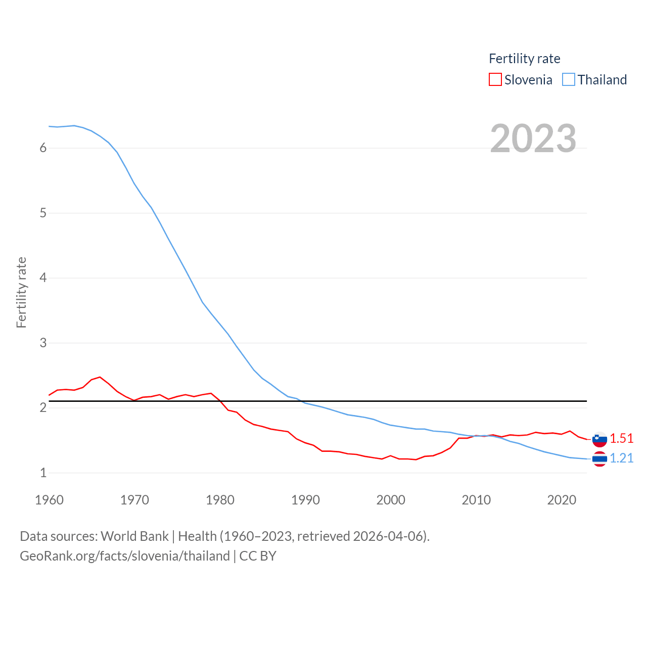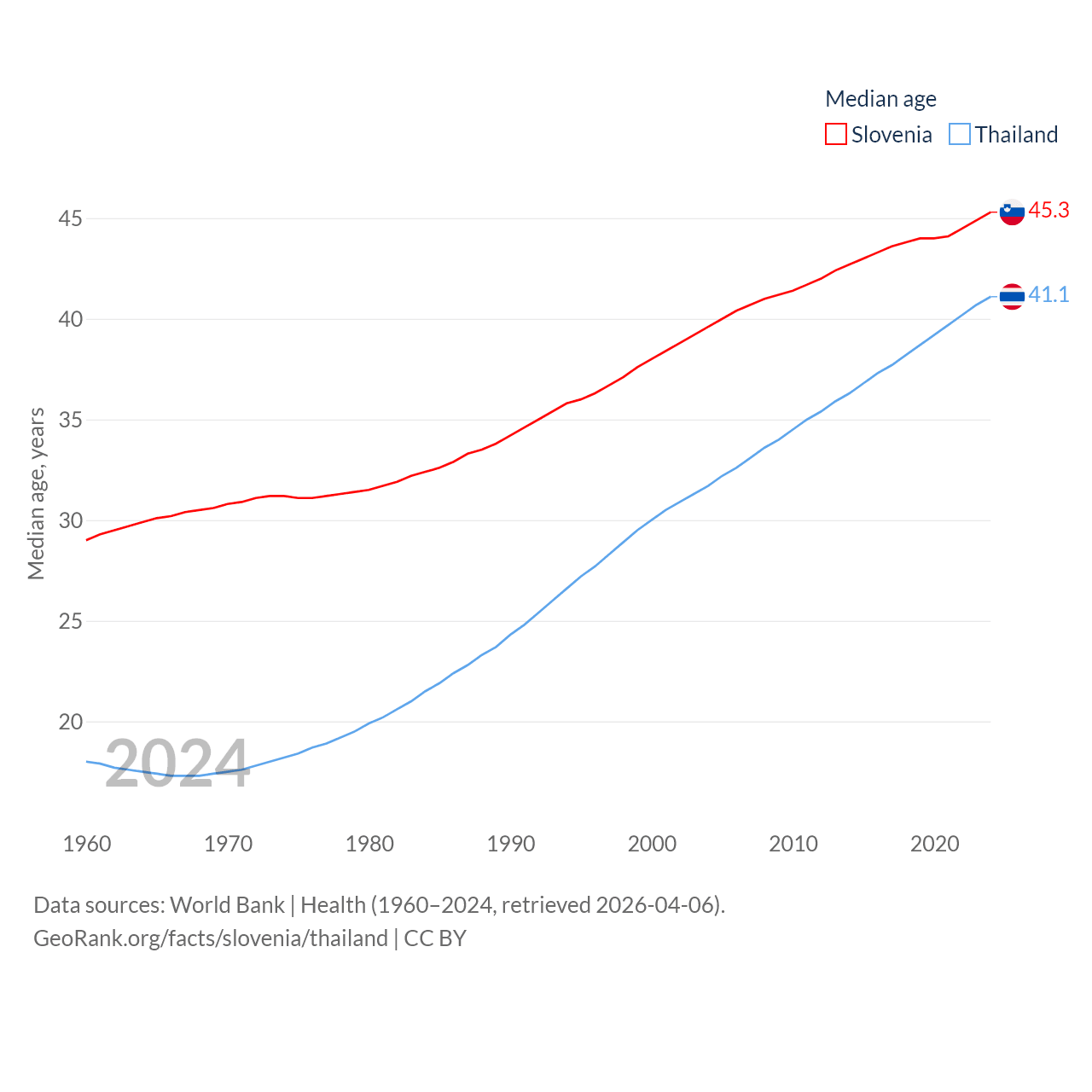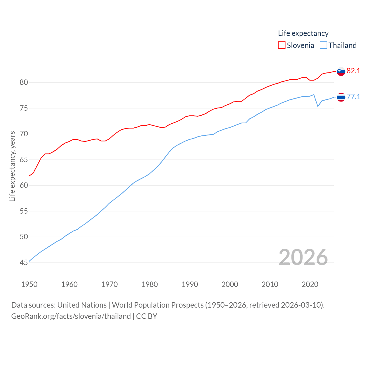 Slovenia has a population of 2.13M (ranked 147/197), compared with 71.7M in Thailand (ranked 20/197). Slovenia's land area is 7,774 sq mi versus 197,256 sq mi for Thailand (ranked 151st vs. 50th).