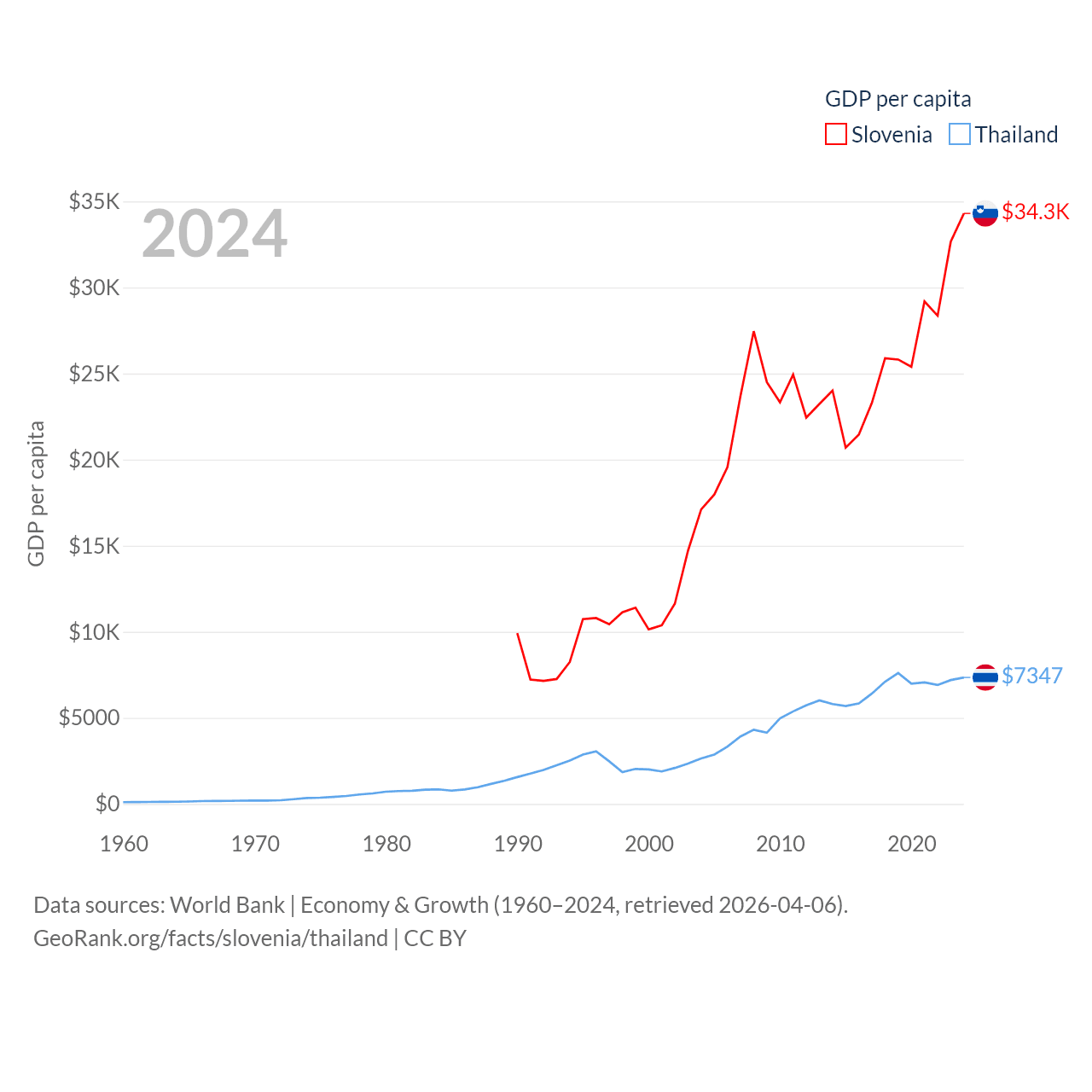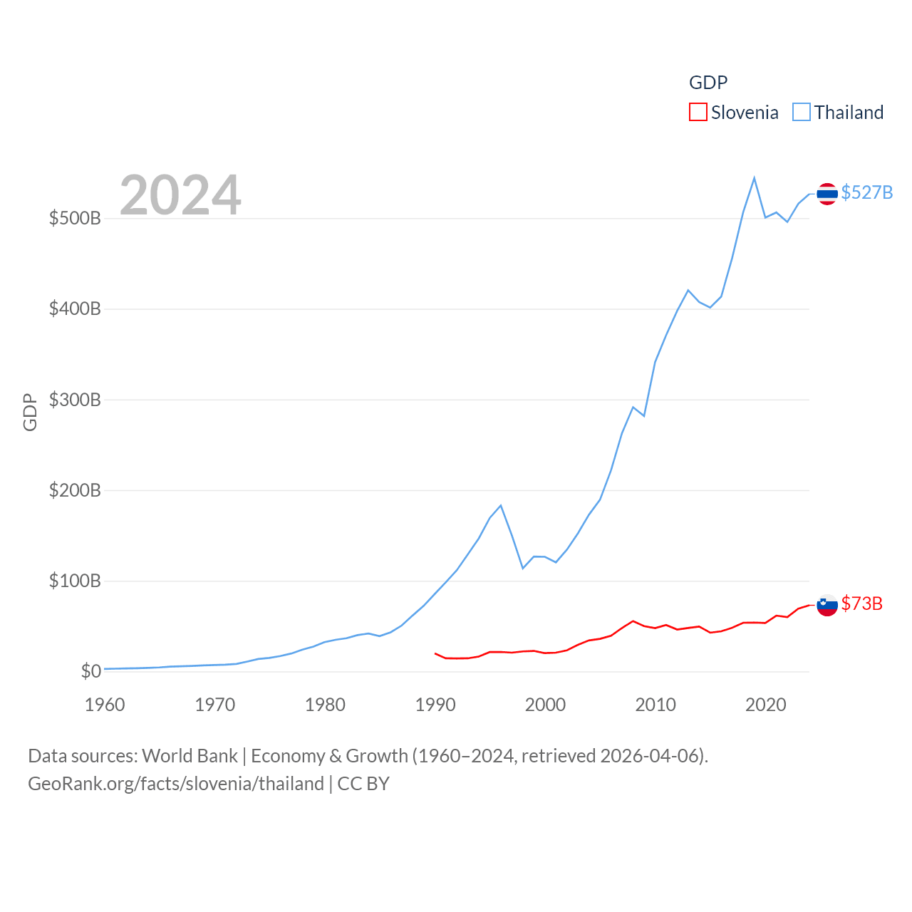By GDP, Slovenia ranks 86/197 ($73B) and Thailand ranks 31/197 ($527B). By GDP per capita, Slovenia ranks 34/197 ($34,301), while Thailand ranks 100/197 ($7,347).