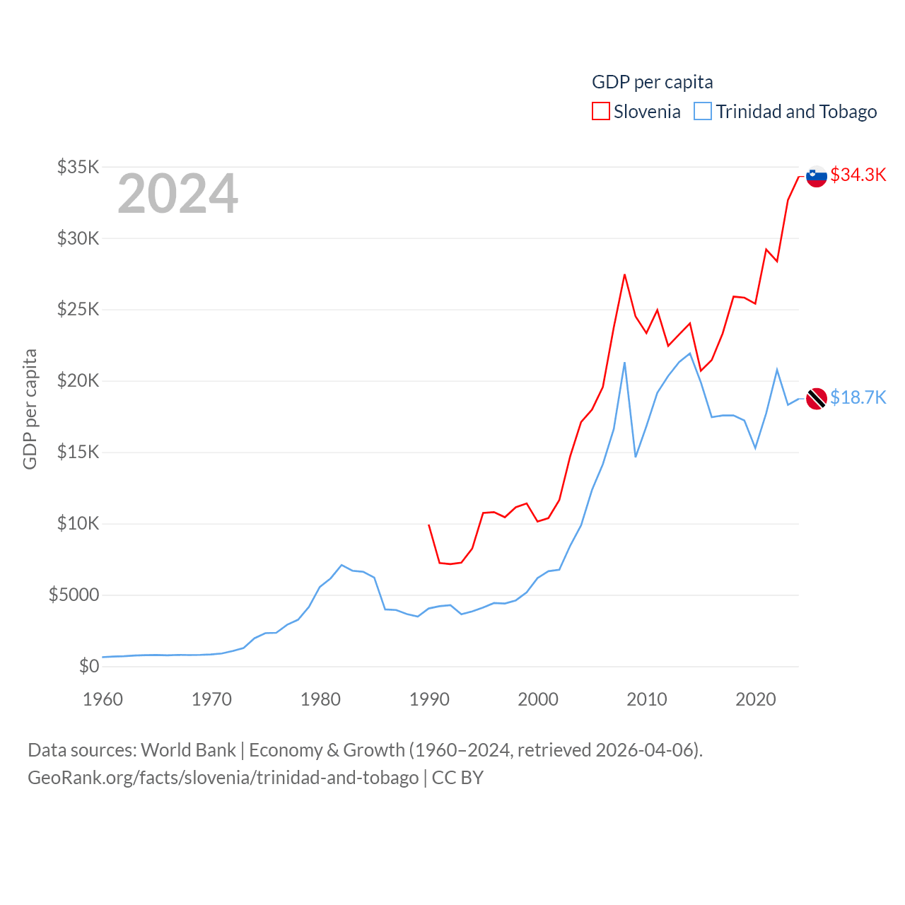 By GDP, Slovenia ranks 86/197 ($73B) and Trinidad and Tobago ranks 115/197 ($25.6B). By GDP per capita, Slovenia ranks 34/197 ($34,301), while Trinidad and Tobago ranks 61/197 ($18,733).