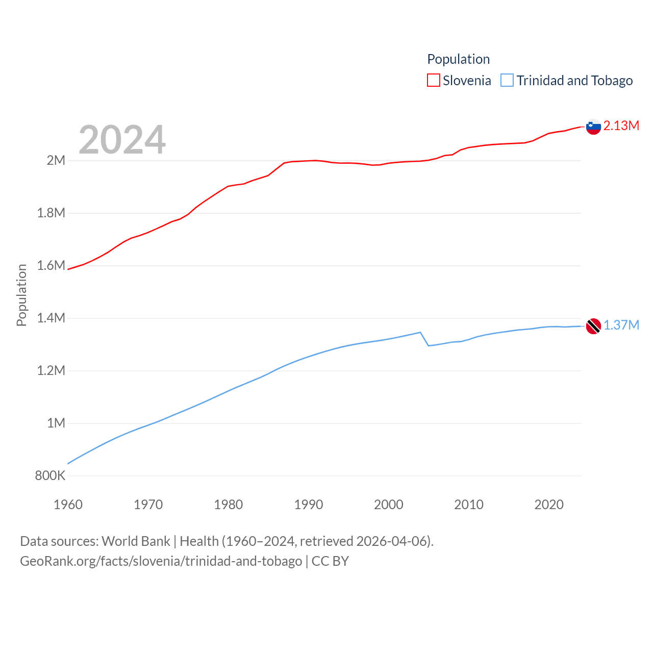 Slovenia has a population of 2.13M (ranked 147/197), compared with 1.37M in Trinidad and Tobago (ranked 154/197). Slovenia's land area is 7,774 sq mi versus 1,981 sq mi for Trinidad and Tobago (ranked 151st vs. 166th).