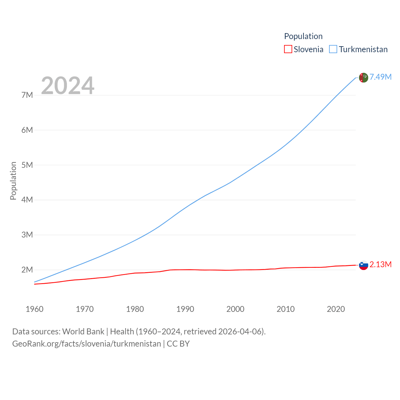 Slovenia has a population of 2.13M (ranked 147/197), compared with 7.49M in Turkmenistan (ranked 104/197). Slovenia's land area is 7,774 sq mi versus 181,441 sq mi for Turkmenistan (ranked 151st vs. 53rd).