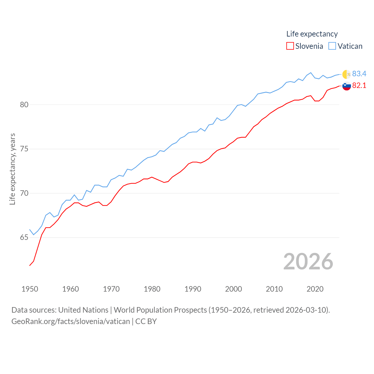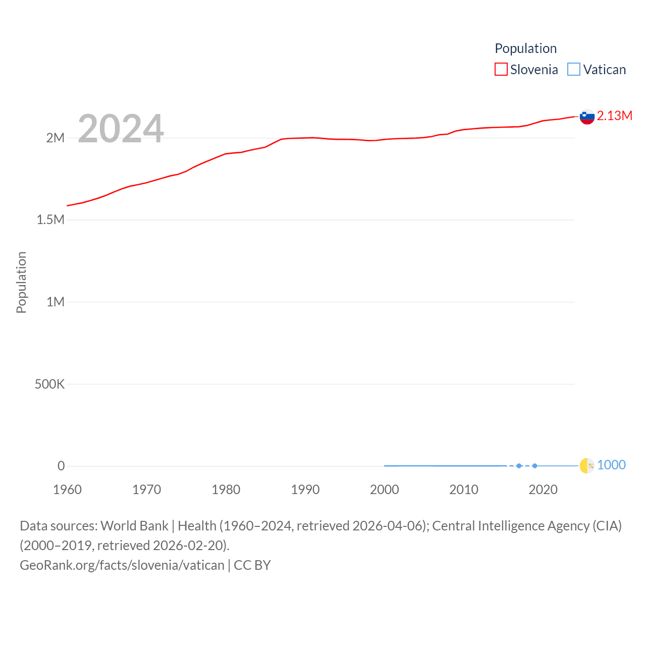 Slovenia has a population of 2.13M (ranked 147/197), compared with 1K in The Vatican (ranked 197/197). Slovenia's land area is 7,774 sq mi versus 0.17 sq mi for The Vatican (ranked 151st vs. 197th).
