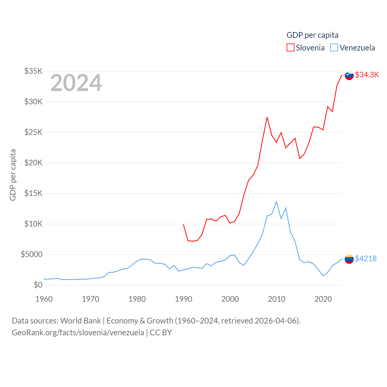 By GDP, Slovenia ranks 86/197 ($73B) and Venezuela ranks 65/197 ($120B). By GDP per capita, Slovenia ranks 34/197 ($34,301), while Venezuela ranks 128/197 ($4,218).