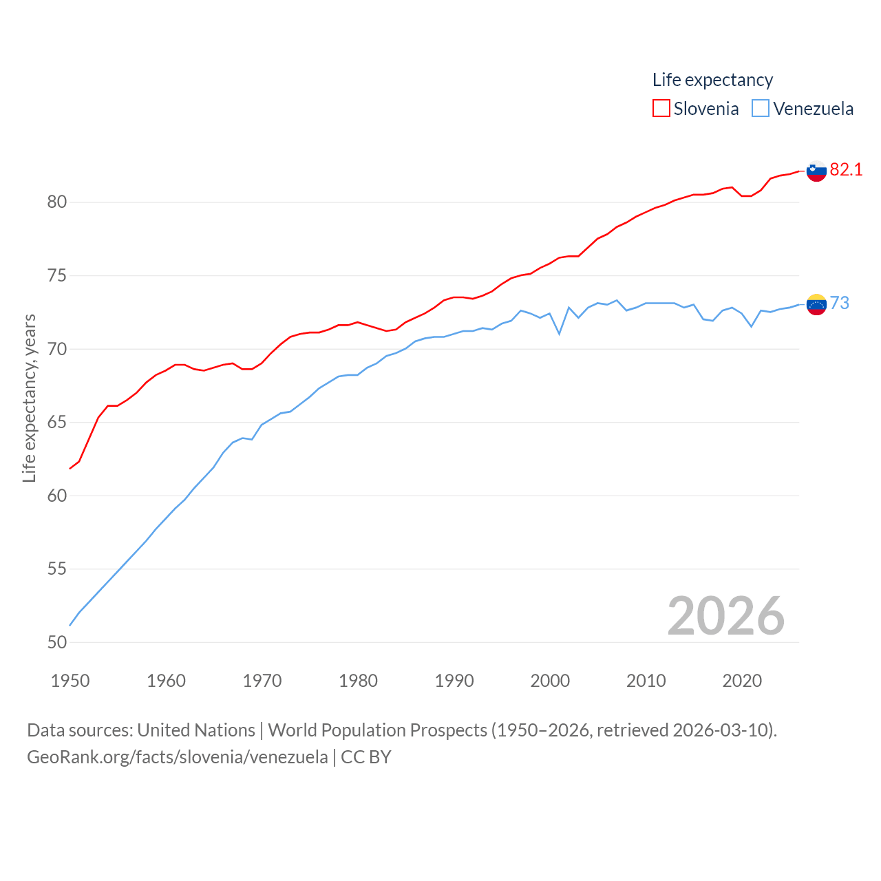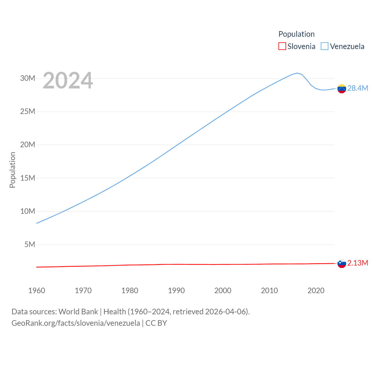 Slovenia has a population of 2.13M (ranked 147/197), compared with 28.4M in Venezuela (ranked 53/197). Slovenia's land area is 7,774 sq mi versus 340,561 sq mi for Venezuela (ranked 151st vs. 32nd).