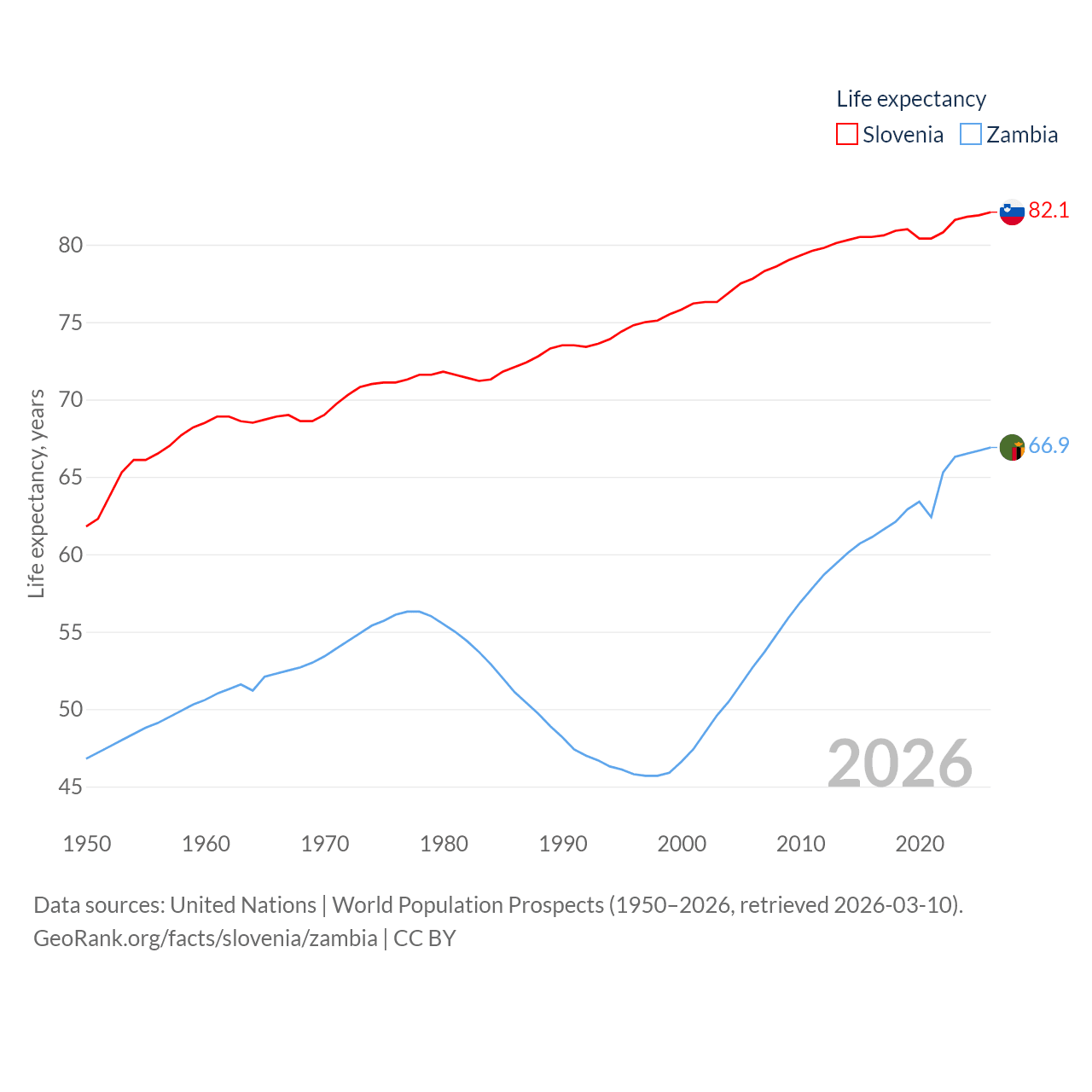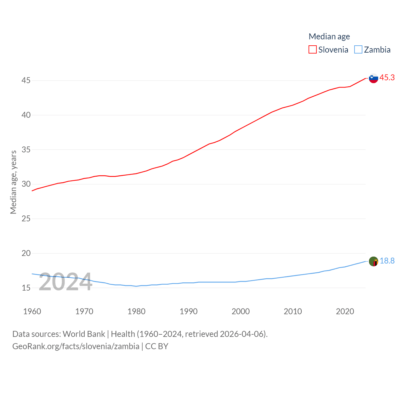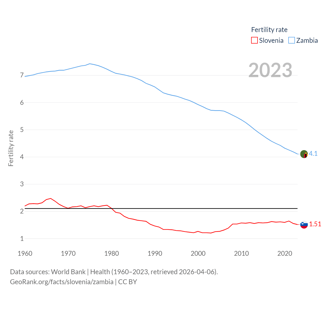 Slovenia has a population of 2.13M (ranked 147/197), compared with 21.3M in Zambia (ranked 63/197). Slovenia's land area is 7,774 sq mi versus 287,024 sq mi for Zambia (ranked 151st vs. 37th).