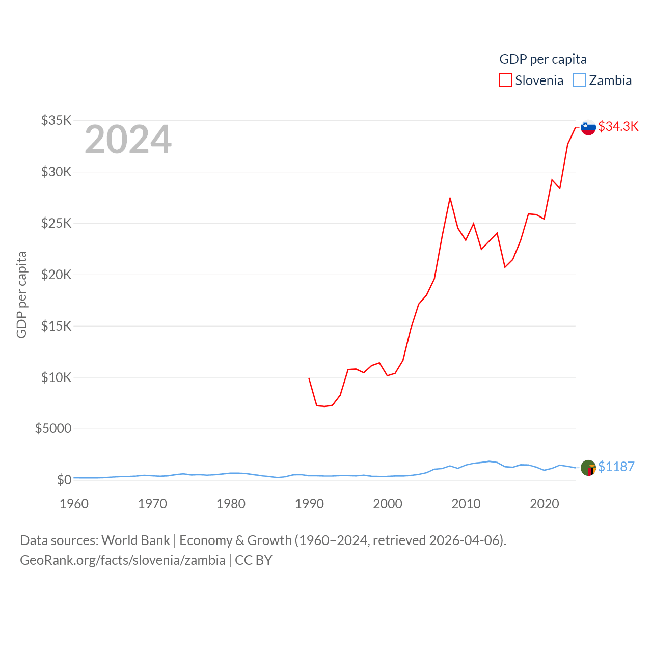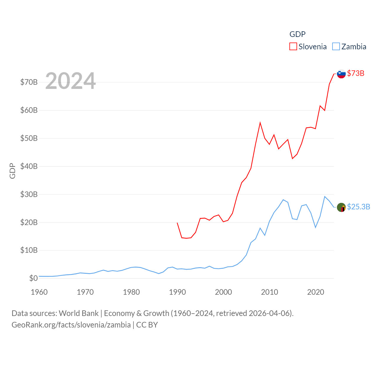 By GDP, Slovenia ranks 86/197 ($73B) and Zambia ranks 116/197 ($25.3B). By GDP per capita, Slovenia ranks 34/197 ($34,301), while Zambia ranks 169/197 ($1,187).