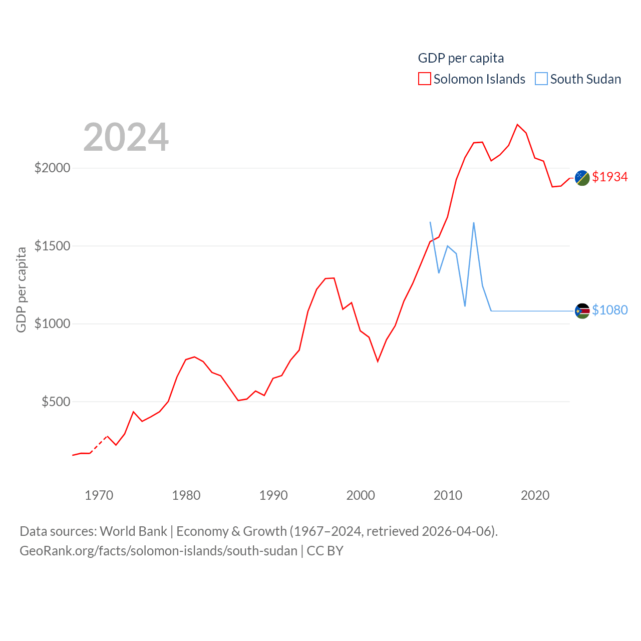 By GDP, The Solomon Islands ranks 182/197 ($1.58B) and South Sudan ranks 149/197 ($12B). By GDP per capita, The Solomon Islands ranks 157/197 ($1,934), while South Sudan ranks 175/197 ($1,080).