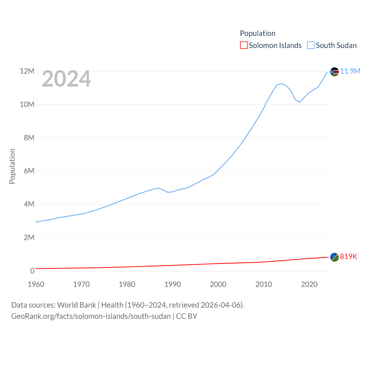 The Solomon Islands has a population of 819K (ranked 162/197), compared with 11.9M in South Sudan (ranked 81/197). The Solomon Islands' land area is 10,807 sq mi versus 243,990 sq mi for South Sudan (ranked 141st vs. 41st).