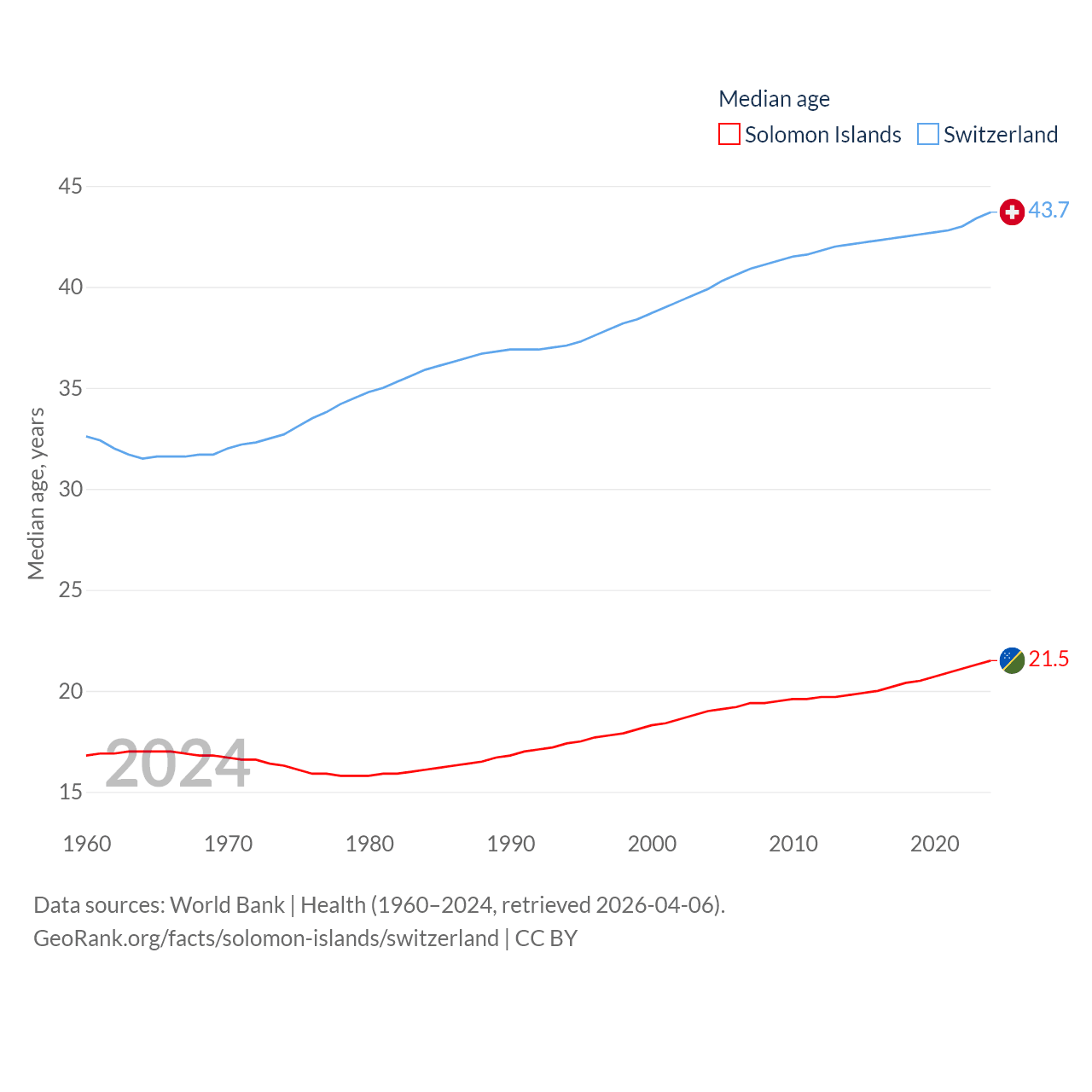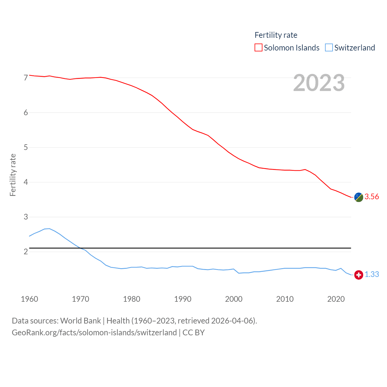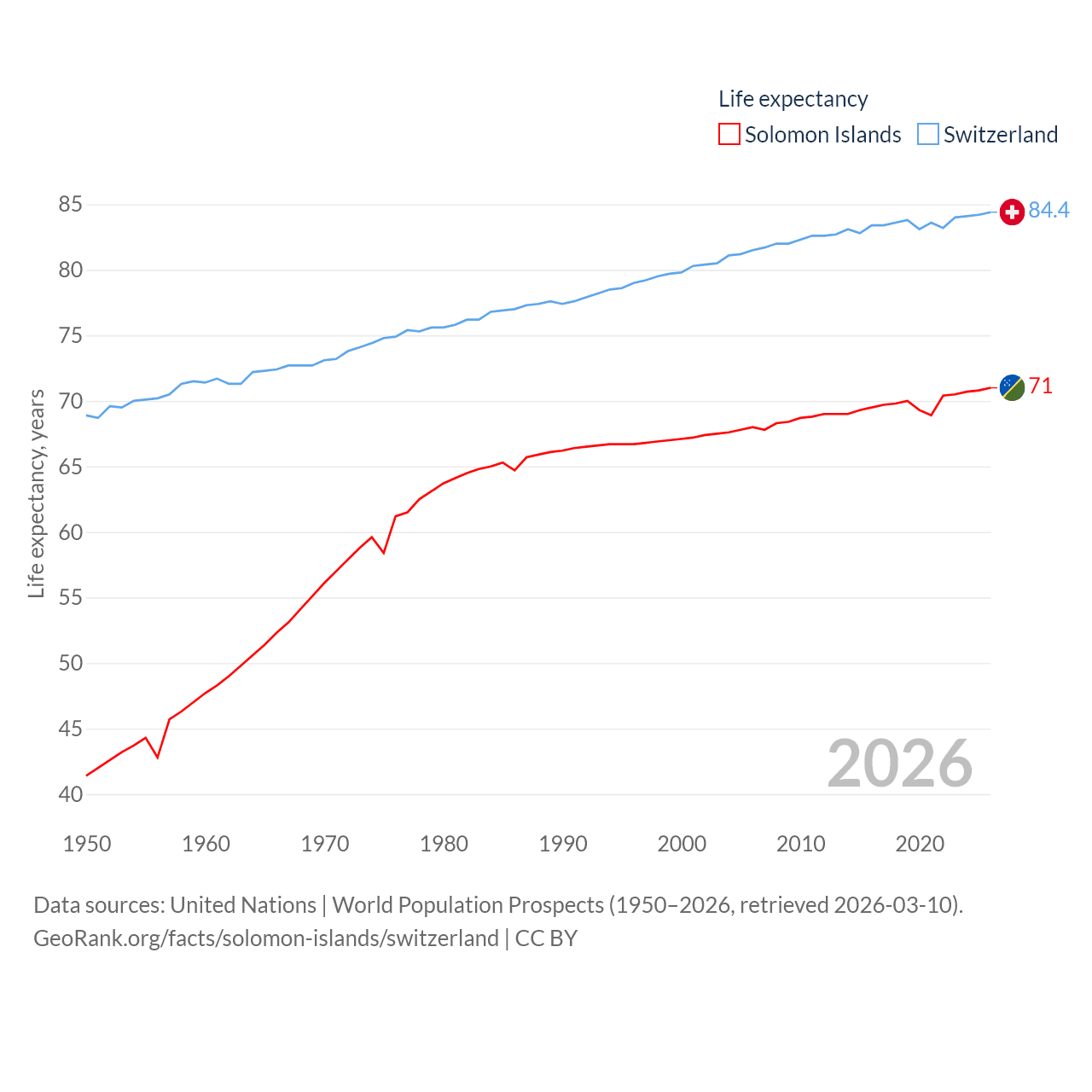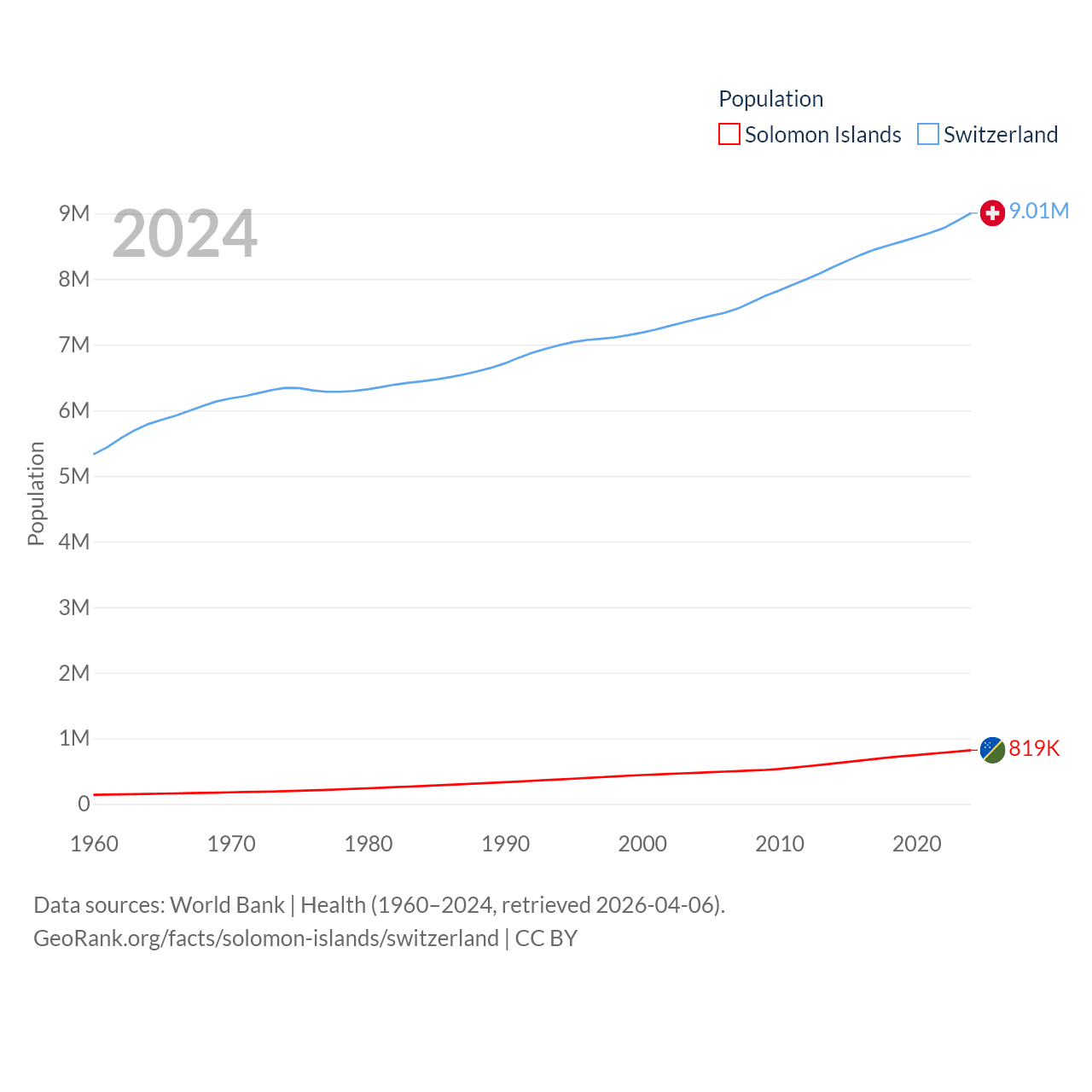 The Solomon Islands has a population of 819K (ranked 162/197), compared with 9.01M in Switzerland (ranked 101/197). The Solomon Islands' land area is 10,807 sq mi versus 15,255 sq mi for Switzerland (ranked 141st vs. 131st).