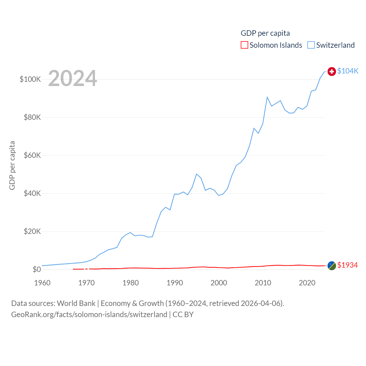 By GDP, The Solomon Islands ranks 182/197 ($1.58B) and Switzerland ranks 20/197 ($937B). By GDP per capita, The Solomon Islands ranks 157/197 ($1,934), while Switzerland ranks 5/197 ($103,998).