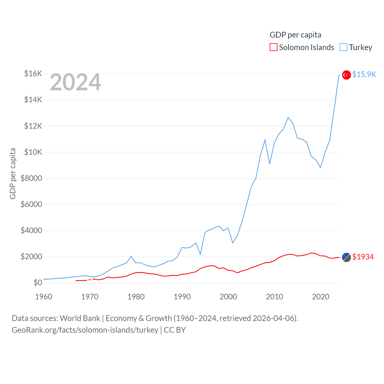 By GDP, The Solomon Islands ranks 182/197 ($1.58B) and Turkey ranks 17/197 ($1.36T). By GDP per capita, The Solomon Islands ranks 157/197 ($1,934), while Turkey ranks 66/197 ($15,893).