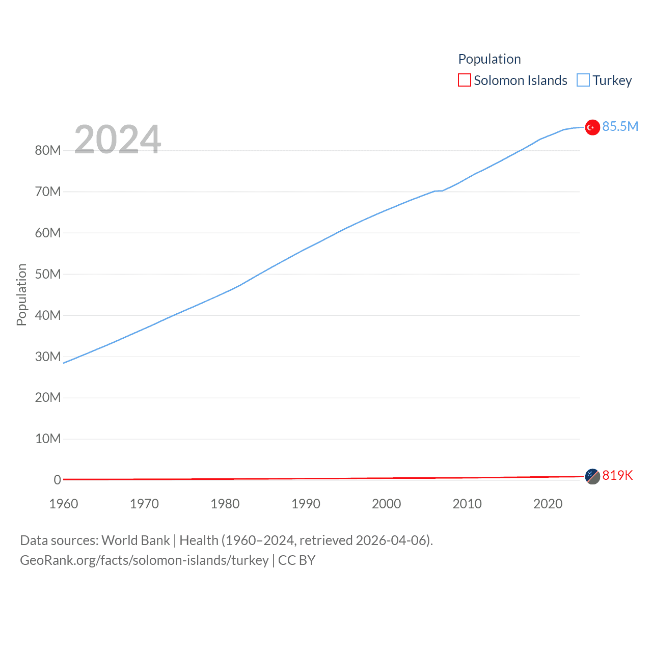 The Solomon Islands has a population of 819K (ranked 162/197), compared with 85.5M in Turkey (ranked 18/197). The Solomon Islands' land area is 10,807 sq mi versus 297,156 sq mi for Turkey (ranked 141st vs. 36th).
