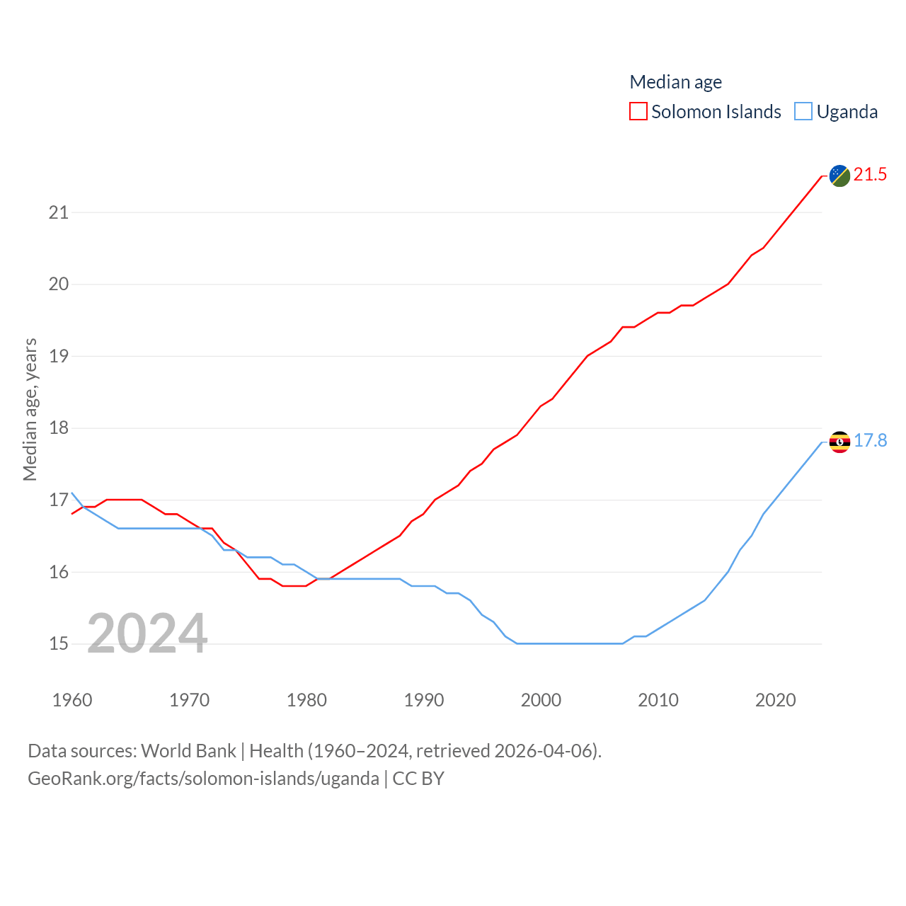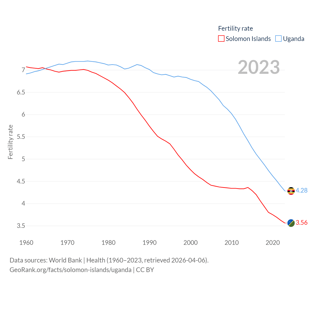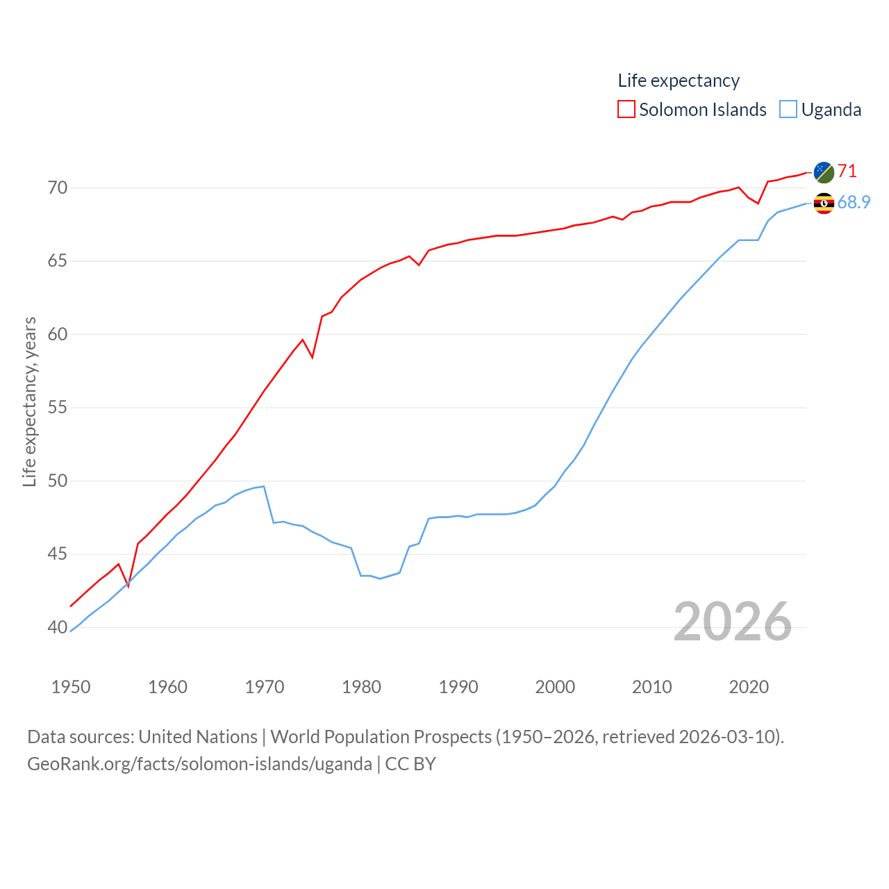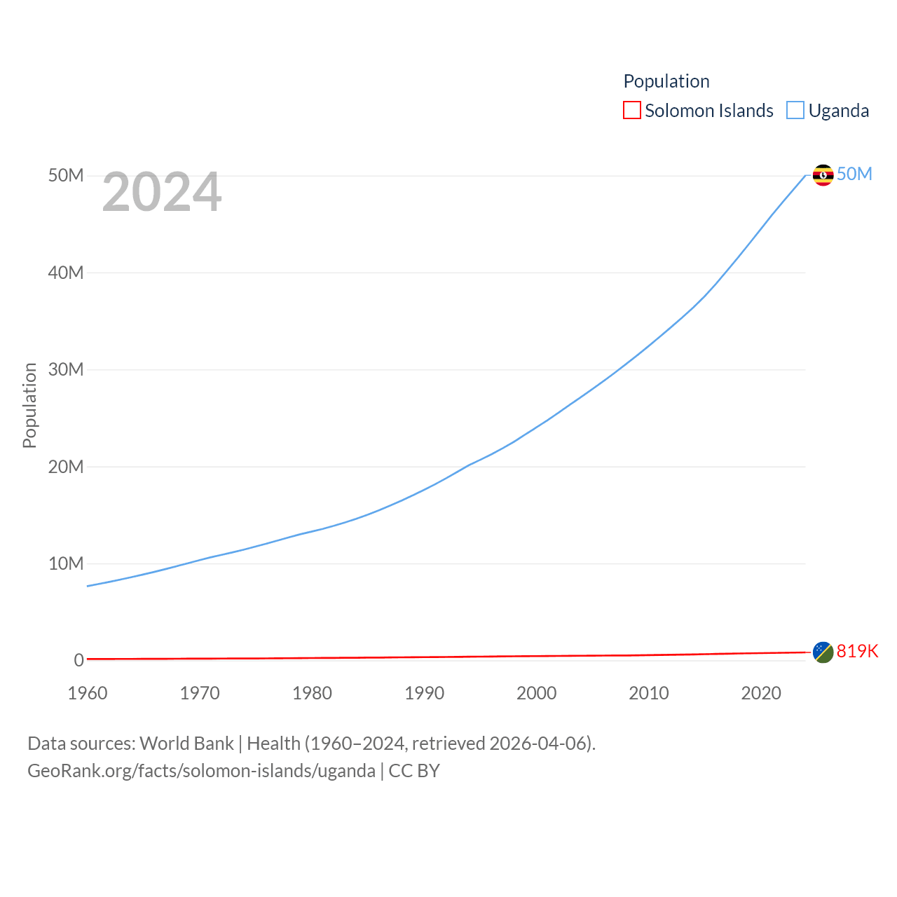 The Solomon Islands has a population of 819K (ranked 162/197), compared with 50M in Uganda (ranked 31/197). The Solomon Islands' land area is 10,807 sq mi versus 77,421 sq mi for Uganda (ranked 141st vs. 84th).