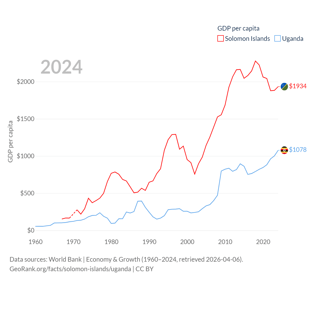 By GDP, The Solomon Islands ranks 182/197 ($1.58B) and Uganda ranks 89/197 ($53.9B). By GDP per capita, The Solomon Islands ranks 157/197 ($1,934), while Uganda ranks 176/197 ($1,078).