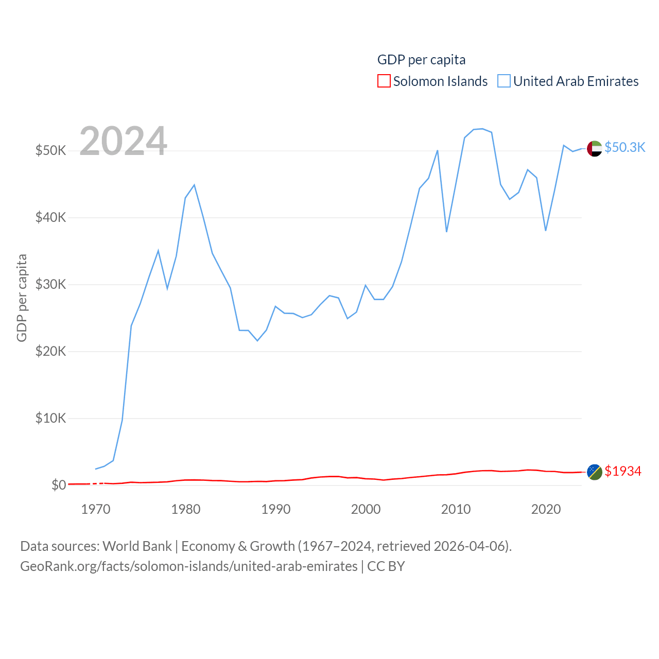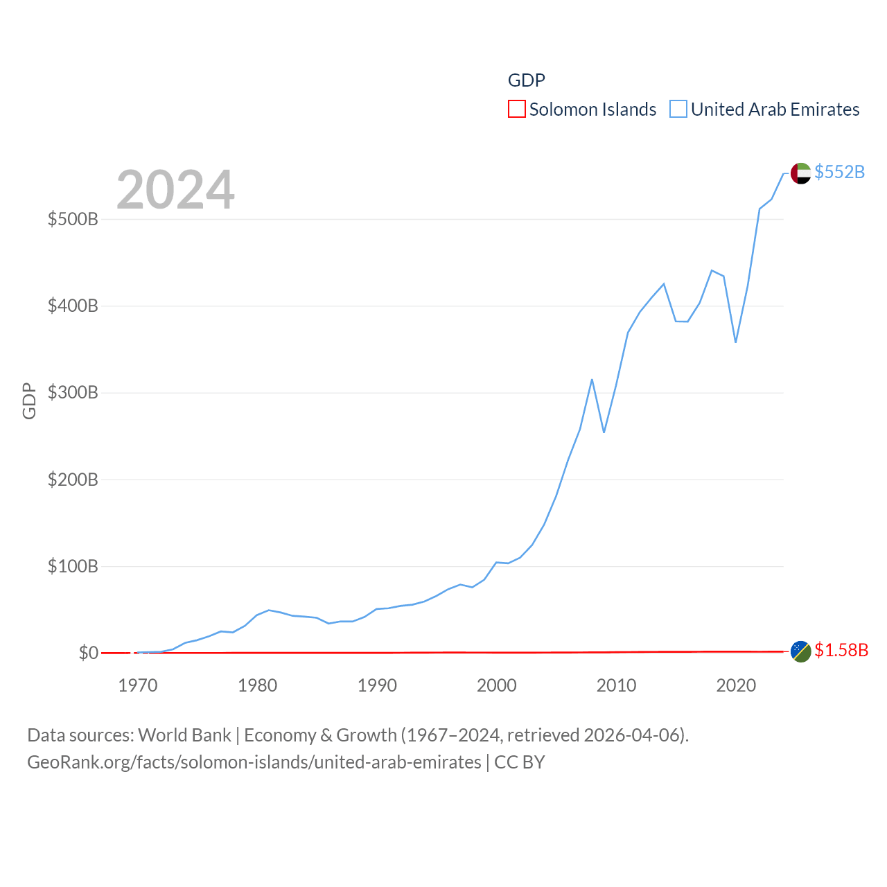 By GDP, The Solomon Islands ranks 182/197 ($1.58B) and The United Arab Emirates ranks 27/197 ($552B). By GDP per capita, The Solomon Islands ranks 157/197 ($1,934), while The United Arab Emirates ranks 24/197 ($50,274).