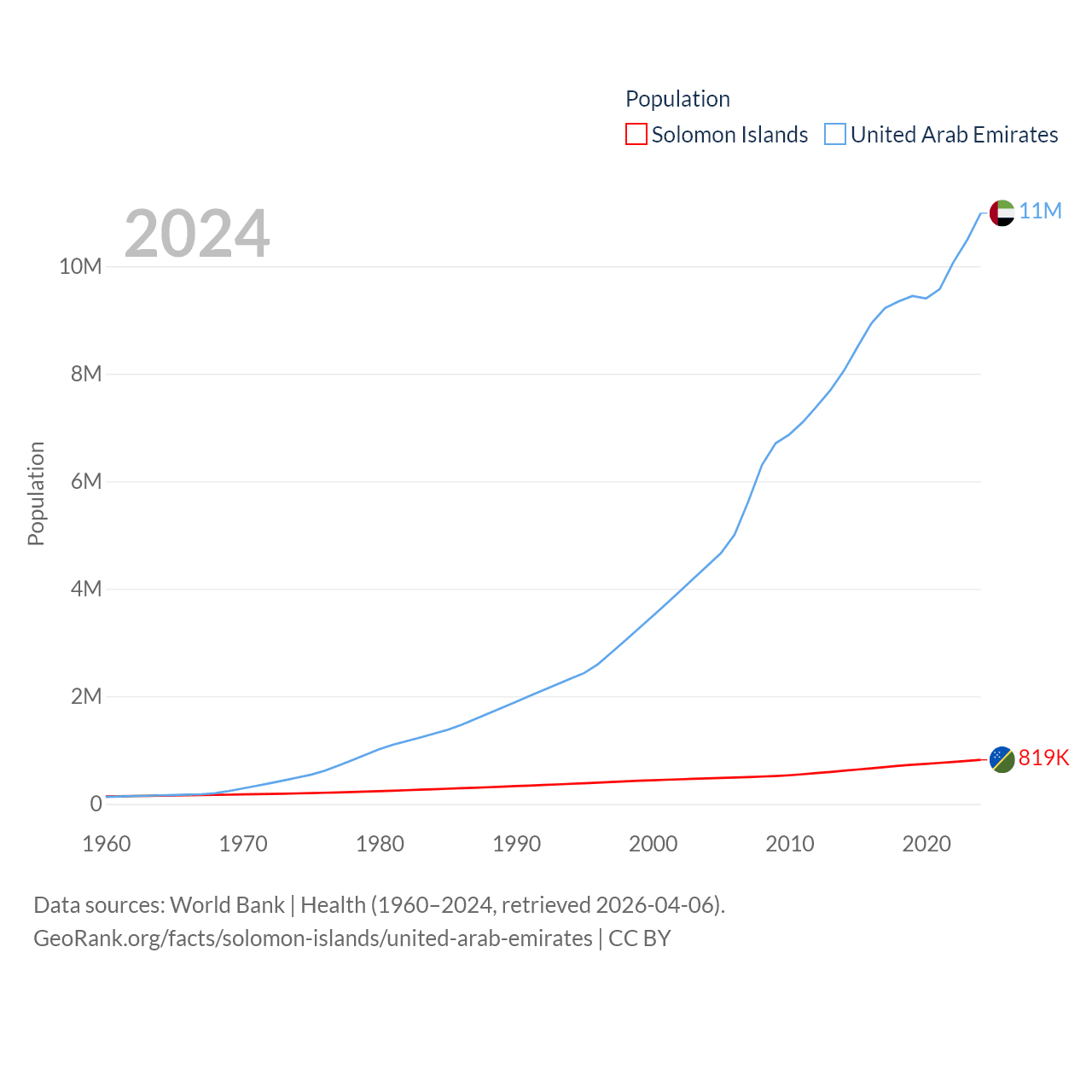 The Solomon Islands has a population of 819K (ranked 162/197), compared with 11M in The United Arab Emirates (ranked 86/197). The Solomon Islands' land area is 10,807 sq mi versus 27,421 sq mi for The United Arab Emirates (ranked 141st vs. 117th).