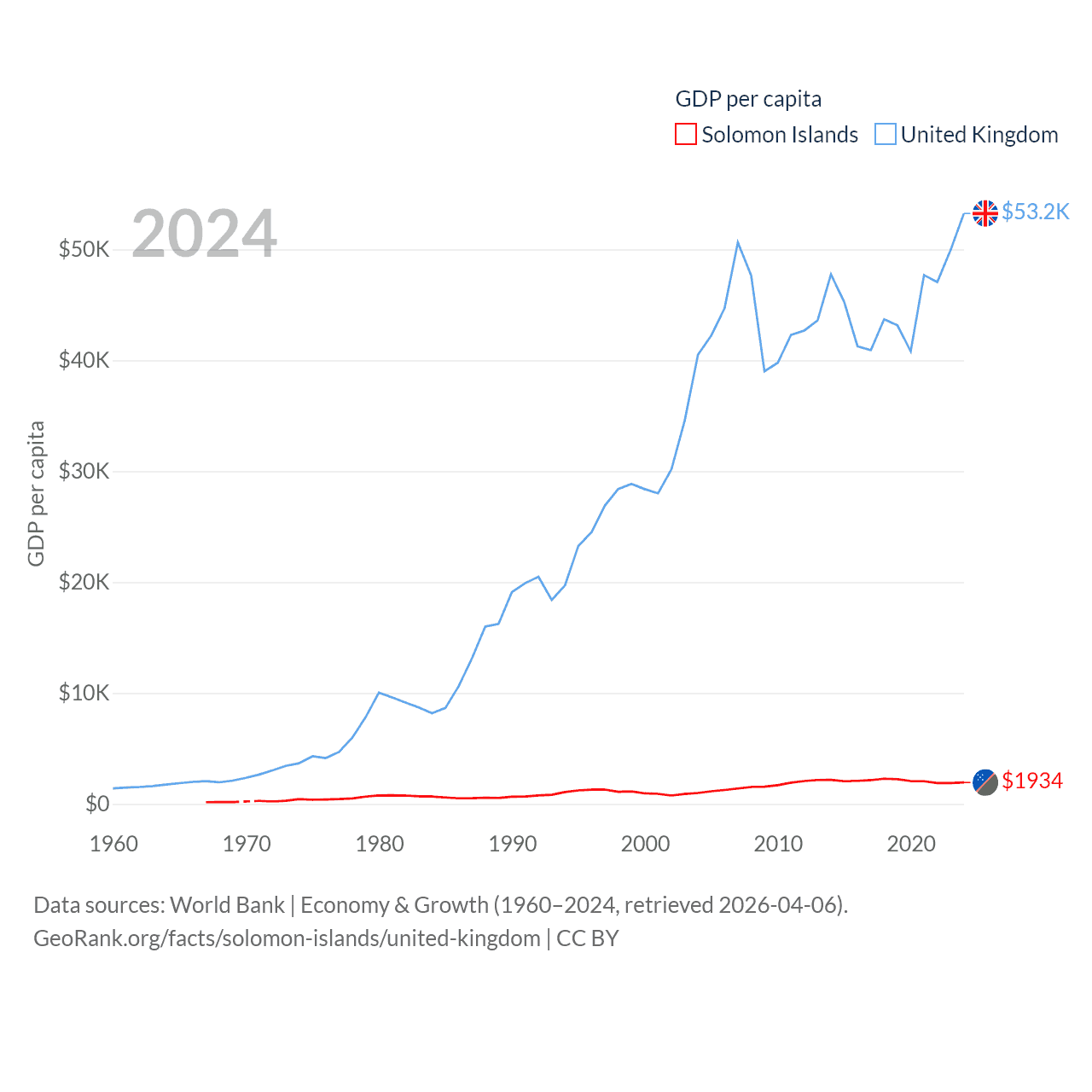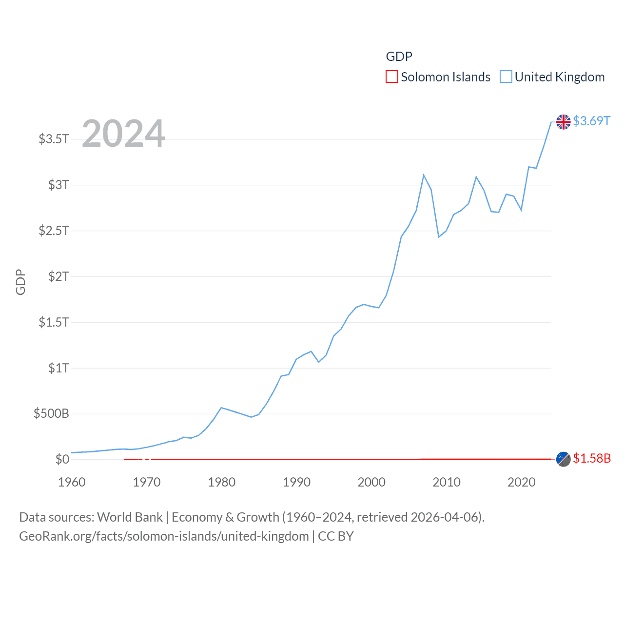 By GDP, The Solomon Islands ranks 182/197 ($1.58B) and The United Kingdom ranks 6/197 ($3.69T). By GDP per capita, The Solomon Islands ranks 157/197 ($1,934), while The United Kingdom ranks 22/197 ($53,246).