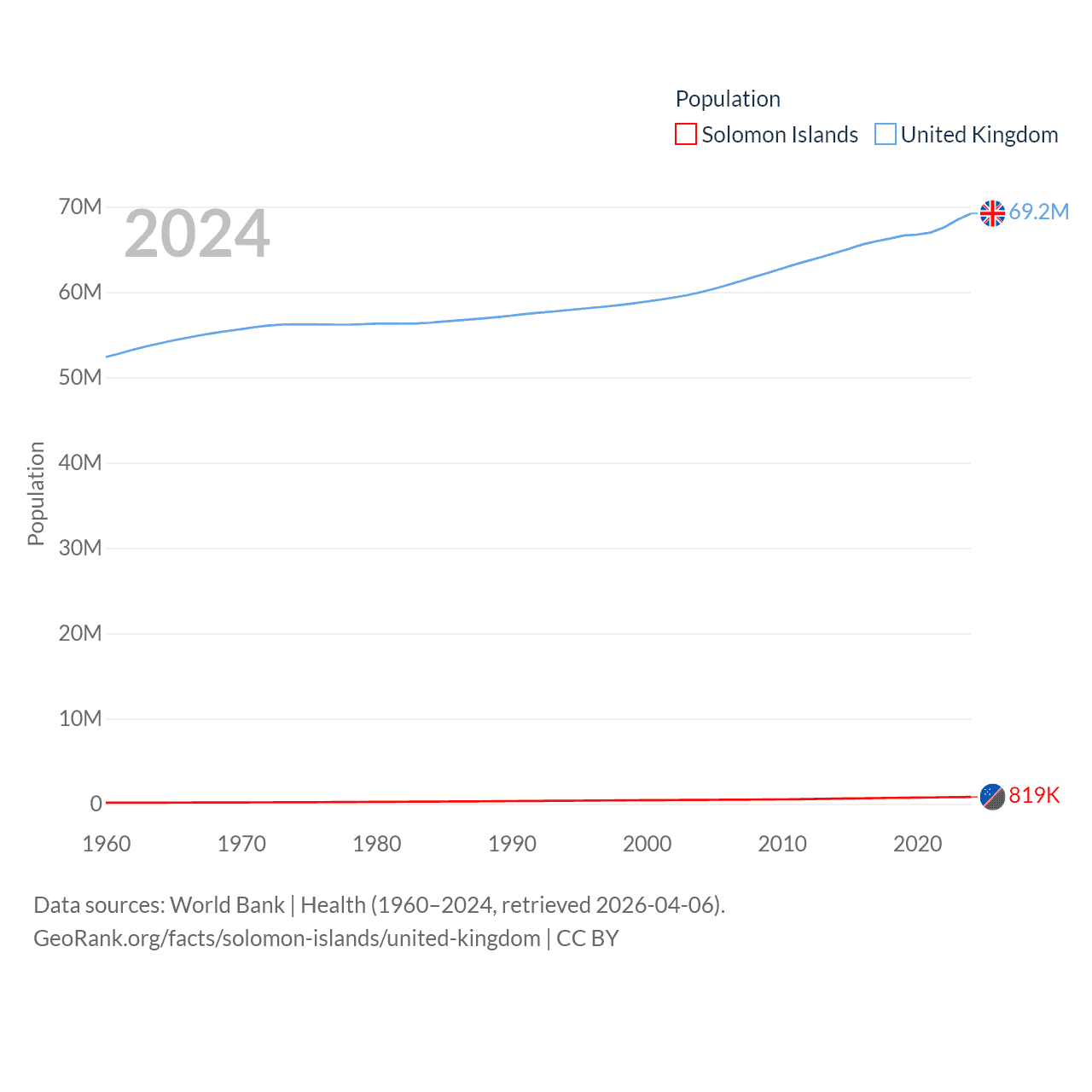 The Solomon Islands has a population of 819K (ranked 162/197), compared with 69.2M in The United Kingdom (ranked 21/197). The Solomon Islands' land area is 10,807 sq mi versus 93,410 sq mi for The United Kingdom (ranked 141st vs. 78th).