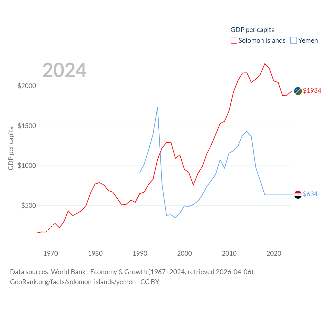 By GDP, The Solomon Islands ranks 182/197 ($1.58B) and Yemen ranks 125/197 ($21.6B). By GDP per capita, The Solomon Islands ranks 157/197 ($1,934), while Yemen ranks 191/197 ($634).