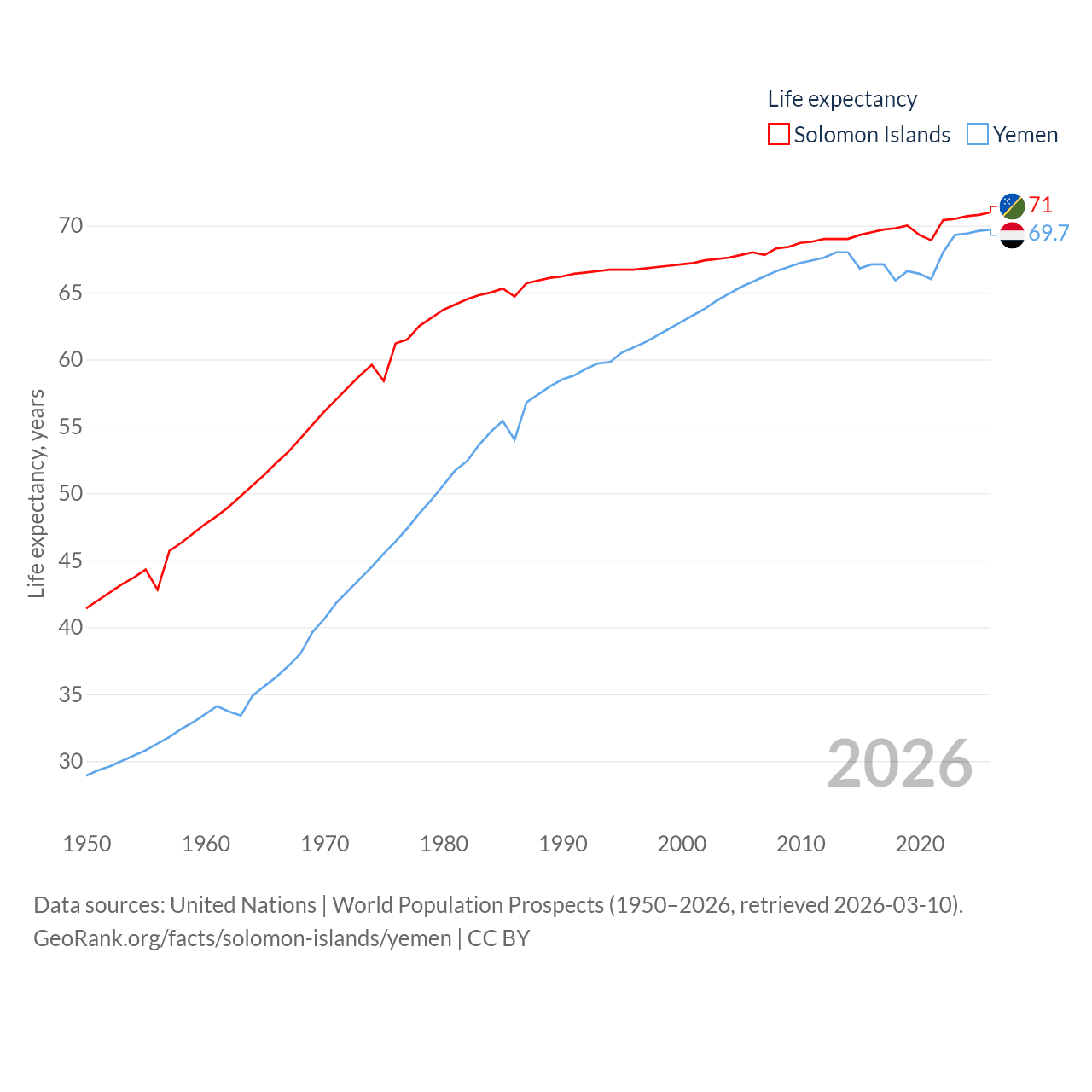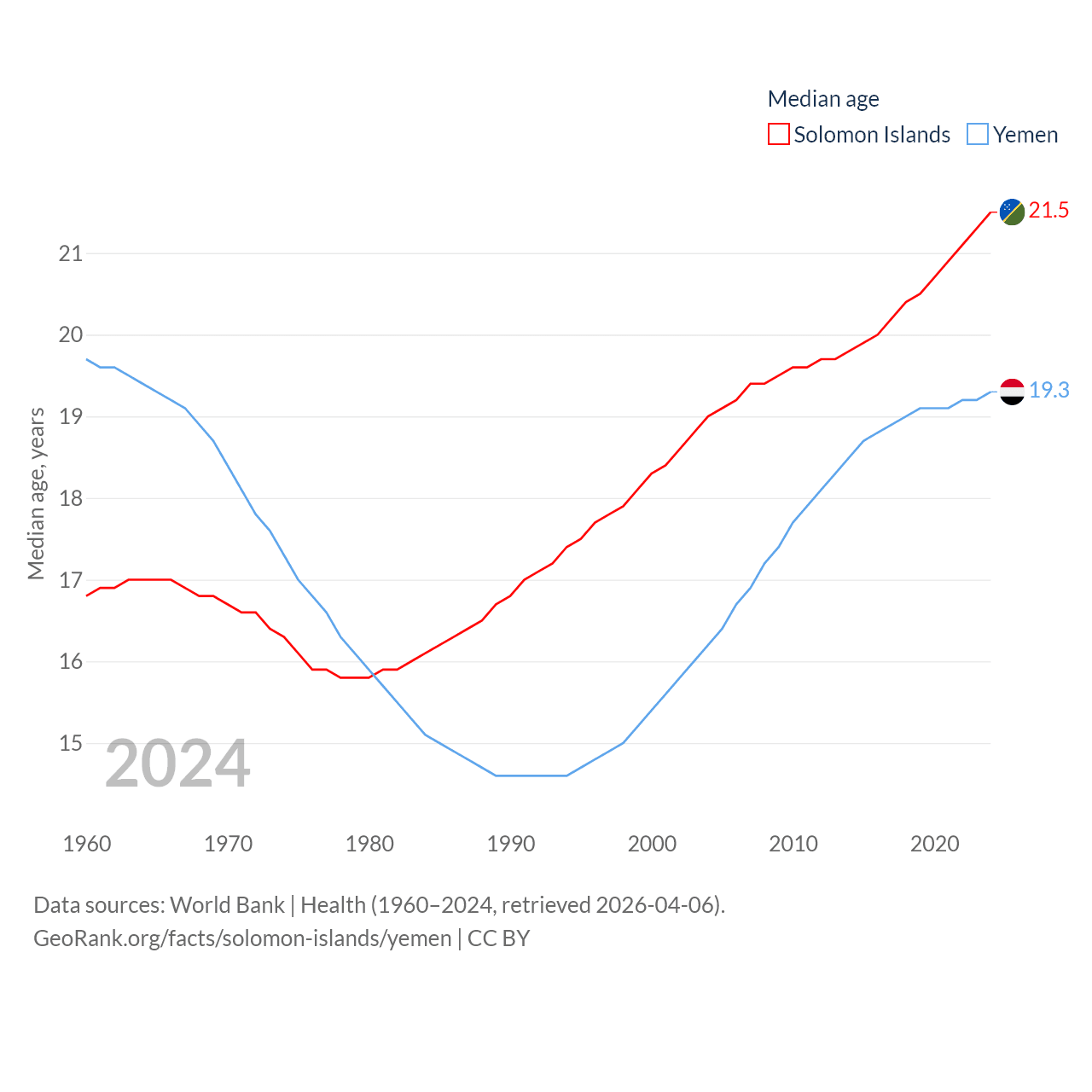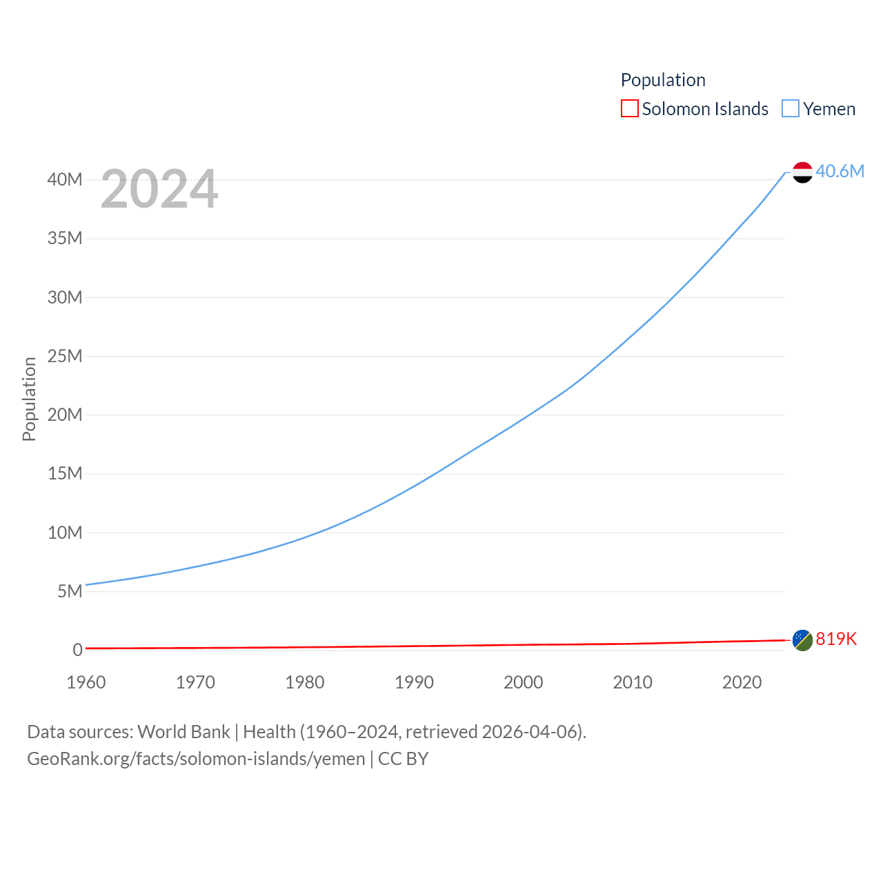 The Solomon Islands has a population of 819K (ranked 162/197), compared with 40.6M in Yemen (ranked 38/197). The Solomon Islands' land area is 10,807 sq mi versus 203,850 sq mi for Yemen (ranked 141st vs. 49th).