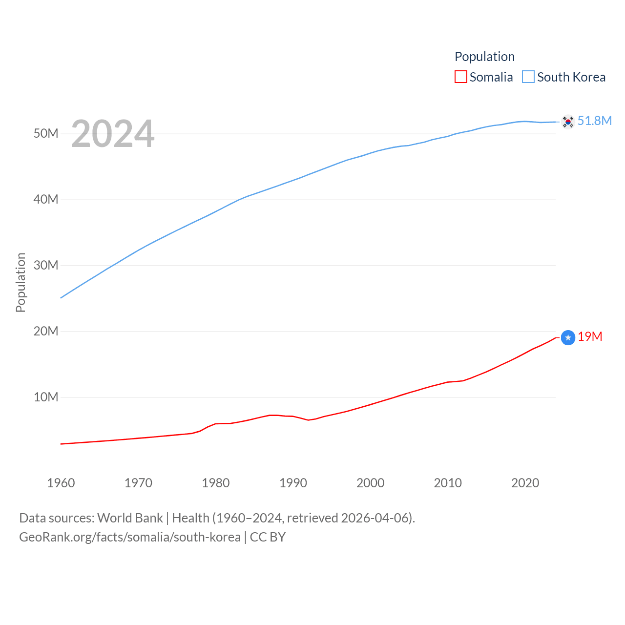Somalia has a population of 19M (ranked 68/197), compared with 51.8M in South Korea (ranked 29/197). Somalia's land area is 242,217 sq mi versus 37,684 sq mi for South Korea (ranked 42nd vs. 105th).