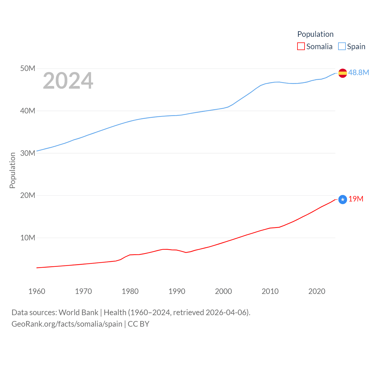Somalia has a population of 19M (ranked 68/197), compared with 48.8M in Spain (ranked 32/197). Somalia's land area is 242,217 sq mi versus 192,934 sq mi for Spain (ranked 42nd vs. 51st).