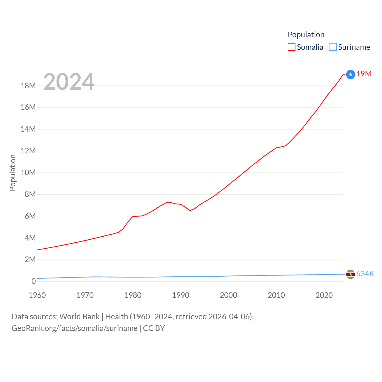 Somalia has a population of 19M (ranked 68/197), compared with 634K in Suriname (ranked 165/197). Somalia's land area is 242,217 sq mi versus 61,972 sq mi for Suriname (ranked 42nd vs. 90th).