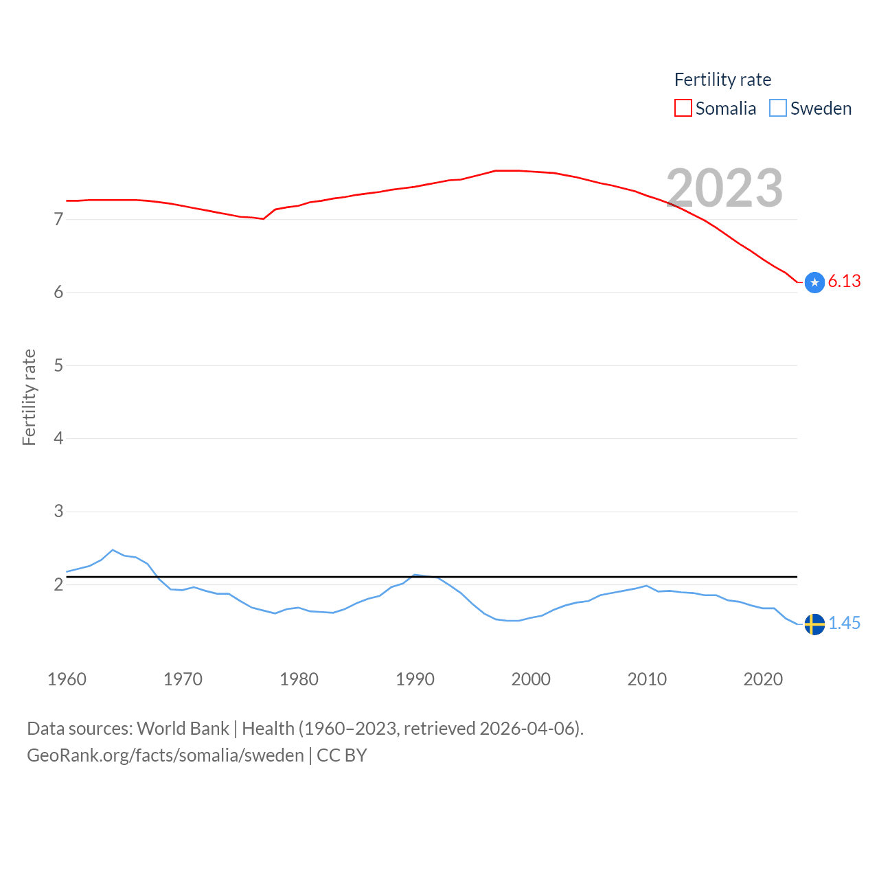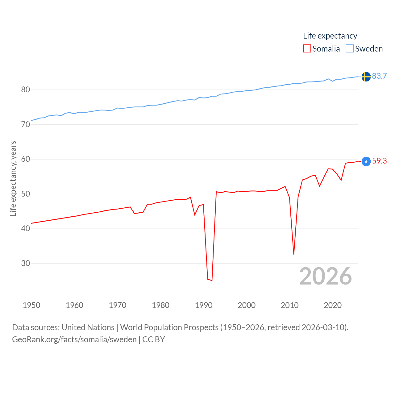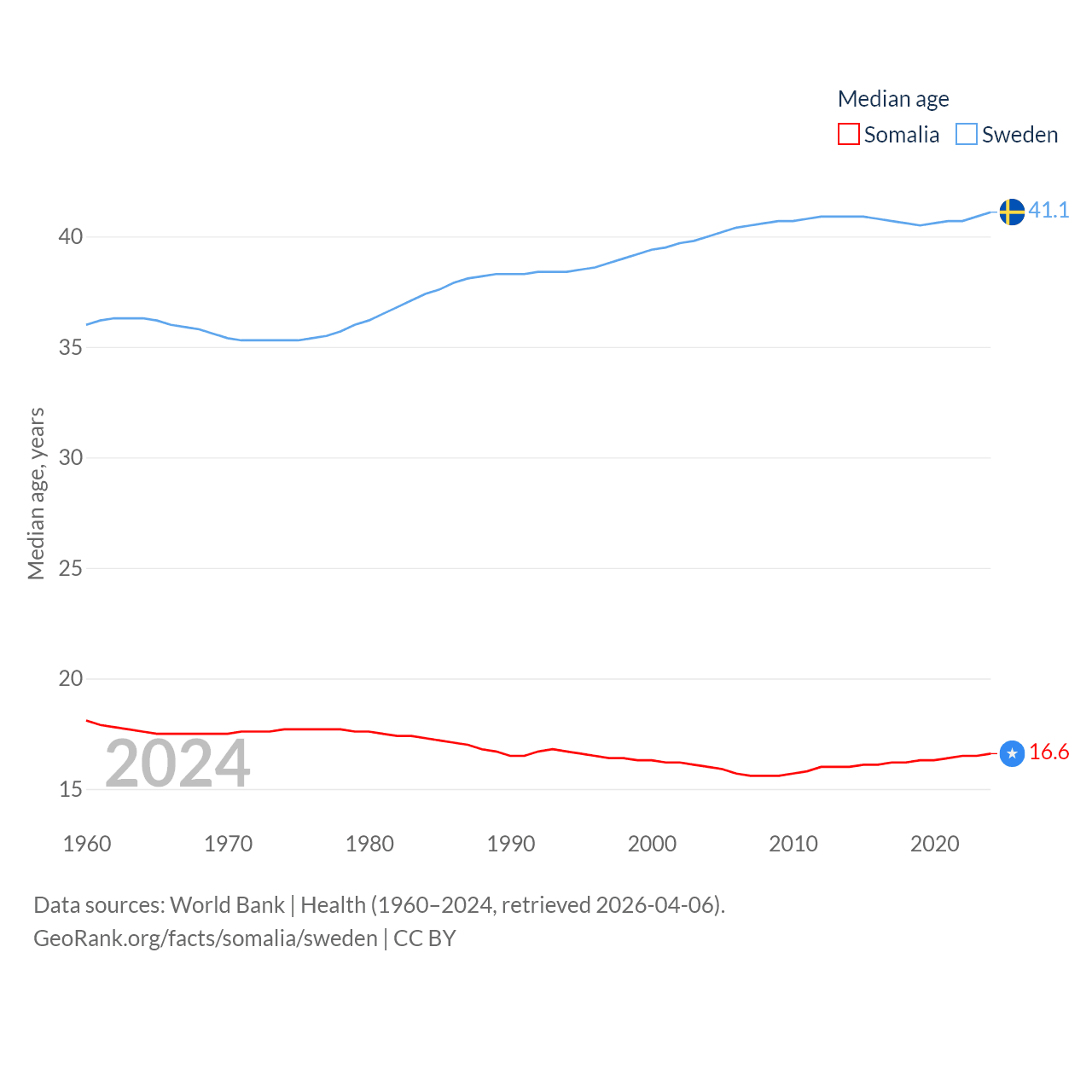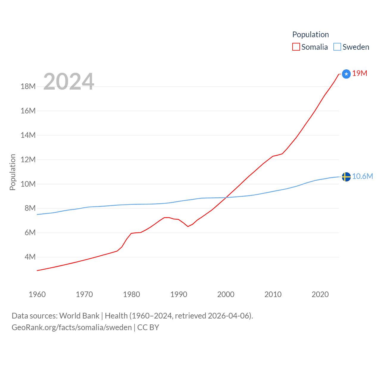 Somalia has a population of 19M (ranked 68/197), compared with 10.6M in Sweden (ranked 93/197). Somalia's land area is 242,217 sq mi versus 157,248 sq mi for Sweden (ranked 42nd vs. 58th).