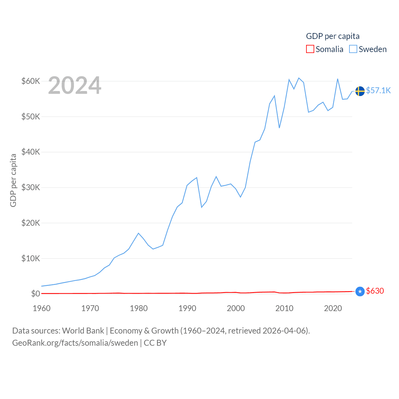 By GDP, Somalia ranks 150/197 ($12B) and Sweden ranks 26/197 ($604B). By GDP per capita, Somalia ranks 192/197 ($630), while Sweden ranks 17/197 ($57,117).