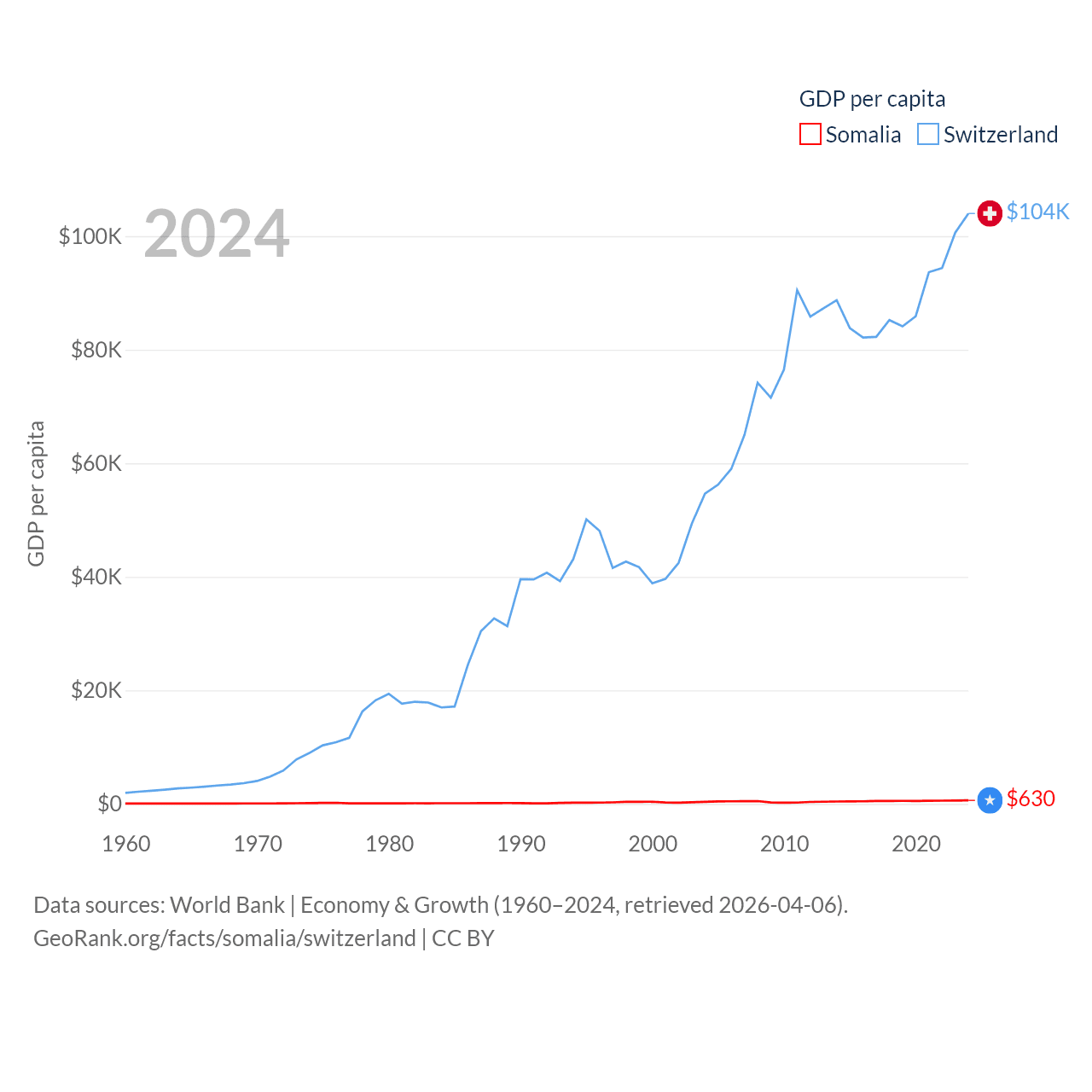 By GDP, Somalia ranks 150/197 ($12B) and Switzerland ranks 20/197 ($937B). By GDP per capita, Somalia ranks 192/197 ($630), while Switzerland ranks 5/197 ($103,998).