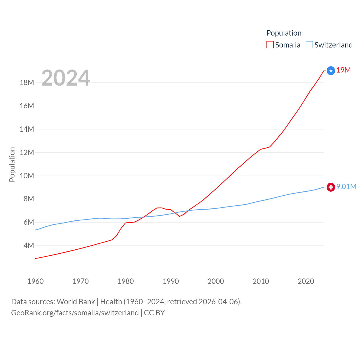 Somalia has a population of 19M (ranked 68/197), compared with 9.01M in Switzerland (ranked 101/197). Somalia's land area is 242,217 sq mi versus 15,255 sq mi for Switzerland (ranked 42nd vs. 131st).