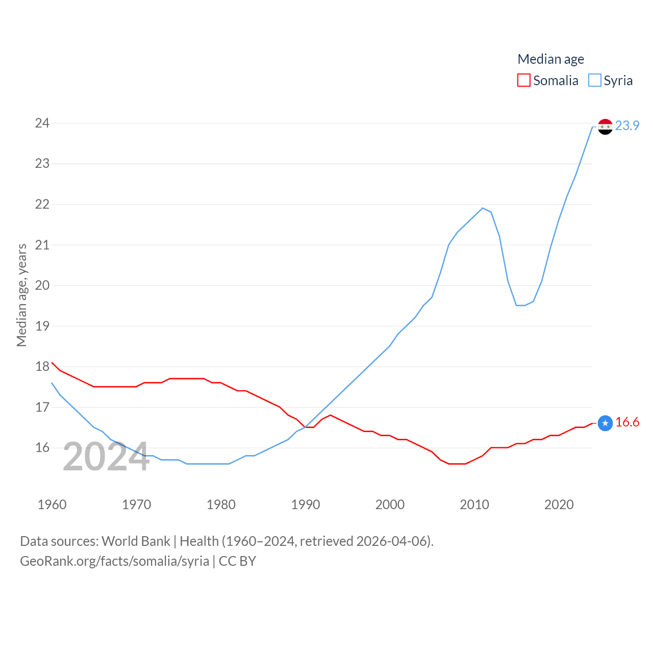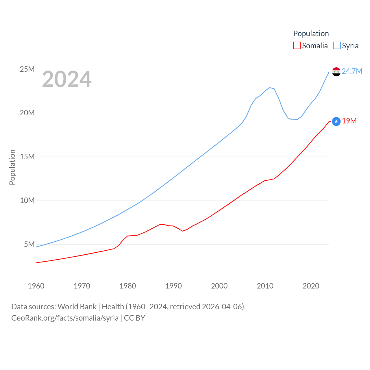 Somalia has a population of 19M (ranked 68/197), compared with 24.7M in Syria (ranked 57/197). Somalia's land area is 242,217 sq mi versus 70,900 sq mi for Syria (ranked 42nd vs. 87th).