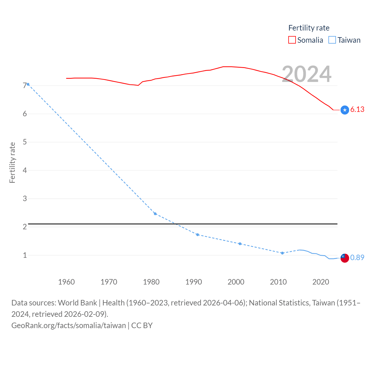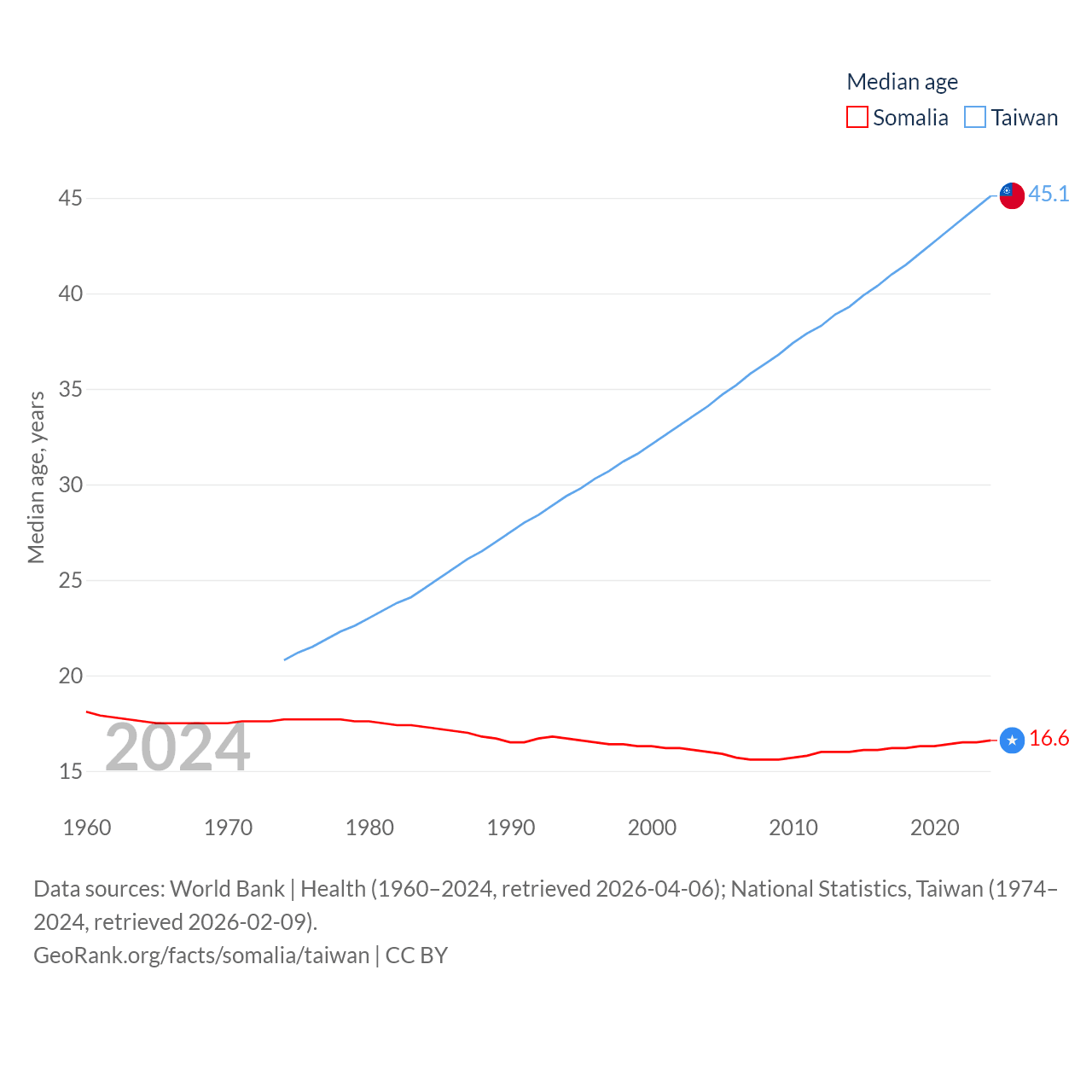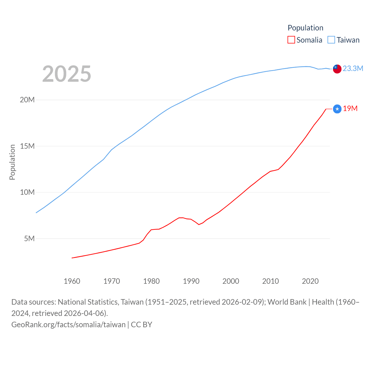 Somalia has a population of 19M (ranked 68/197), compared with 23.3M in Taiwan (ranked 60/197). Somalia's land area is 242,217 sq mi versus 13,976 sq mi for Taiwan (ranked 42nd vs. 133rd).