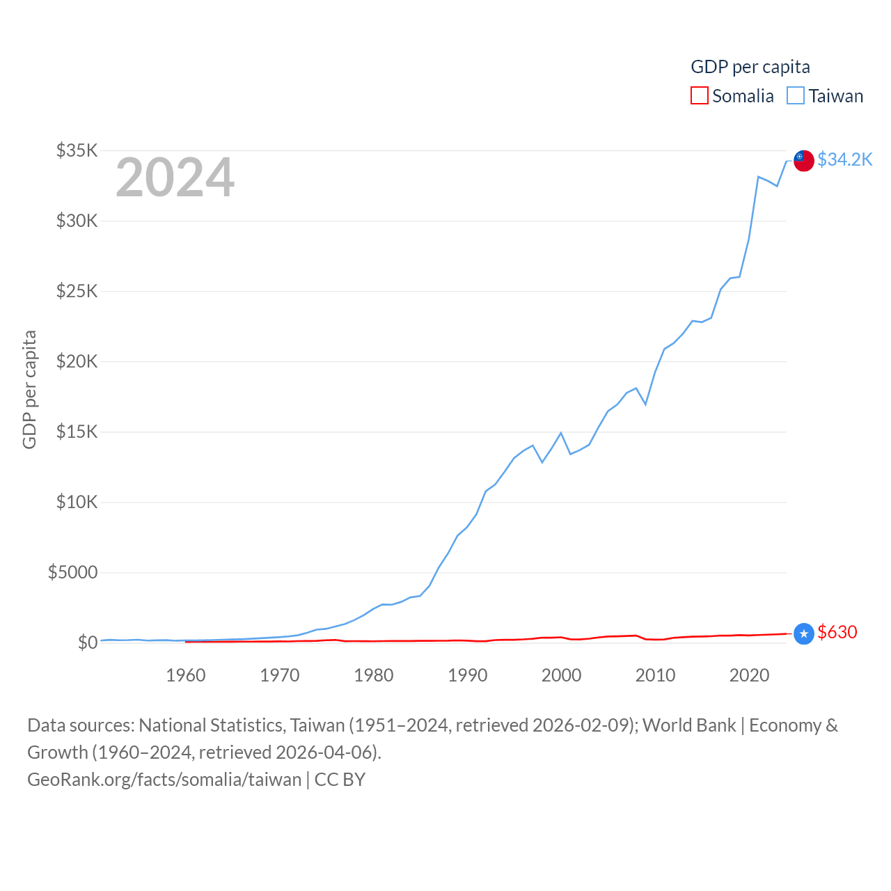 By GDP, Somalia ranks 150/197 ($12B) and Taiwan ranks 22/197 ($802B). By GDP per capita, Somalia ranks 192/197 ($630), while Taiwan ranks 35/197 ($34,238).