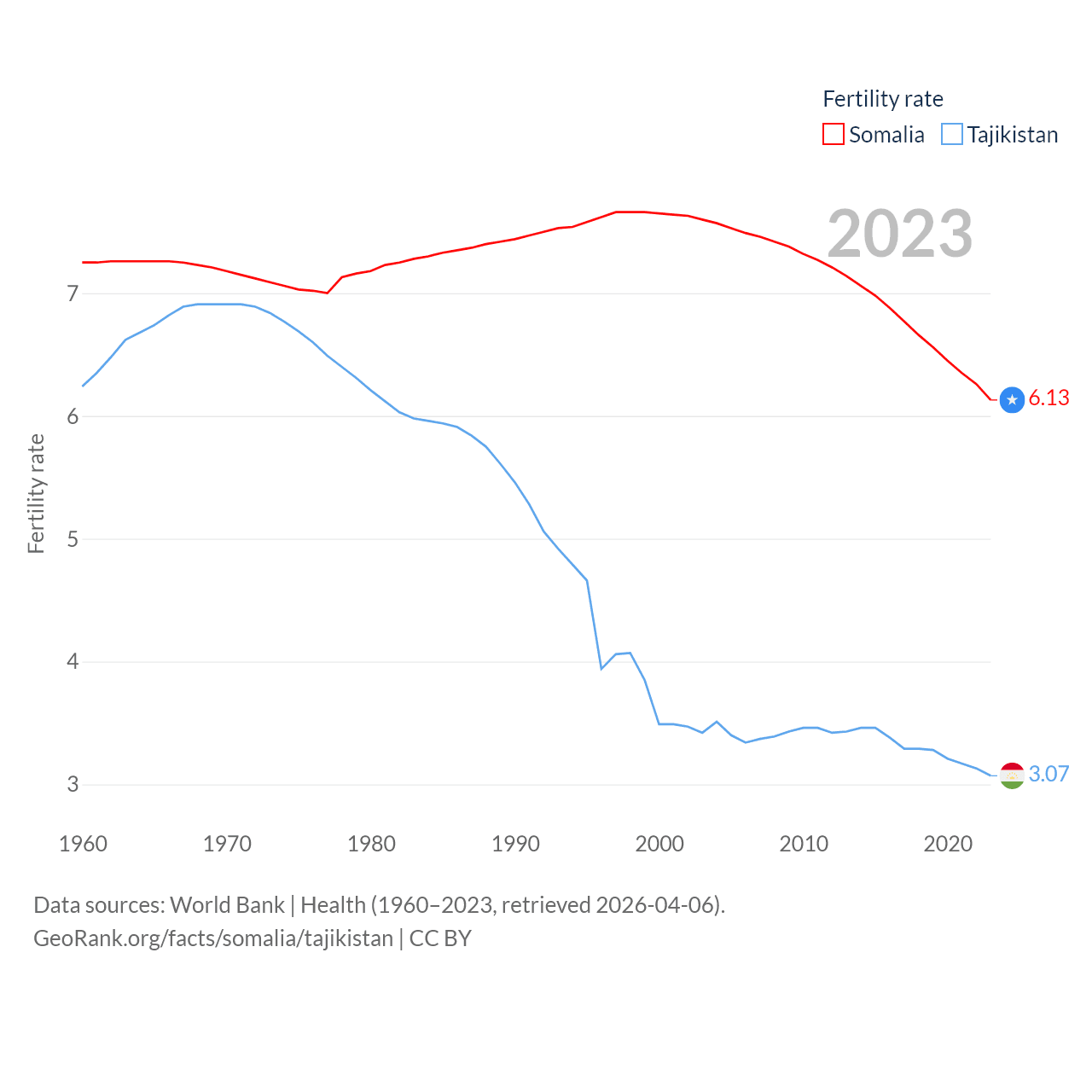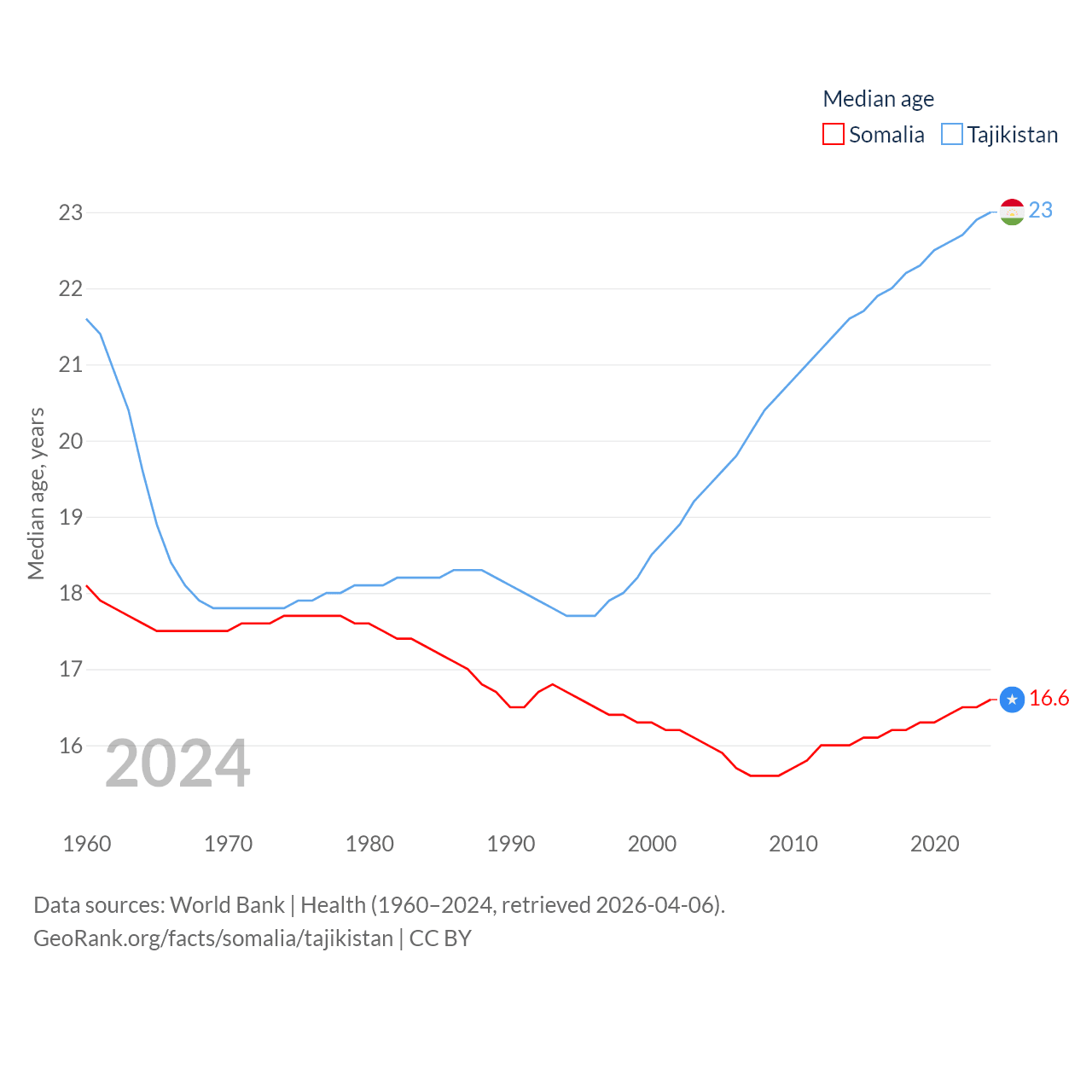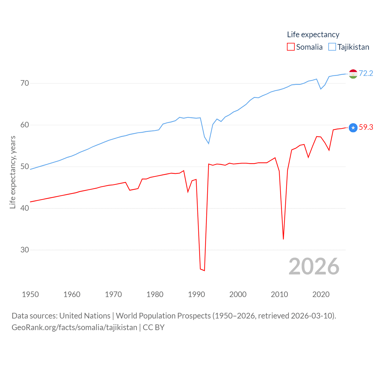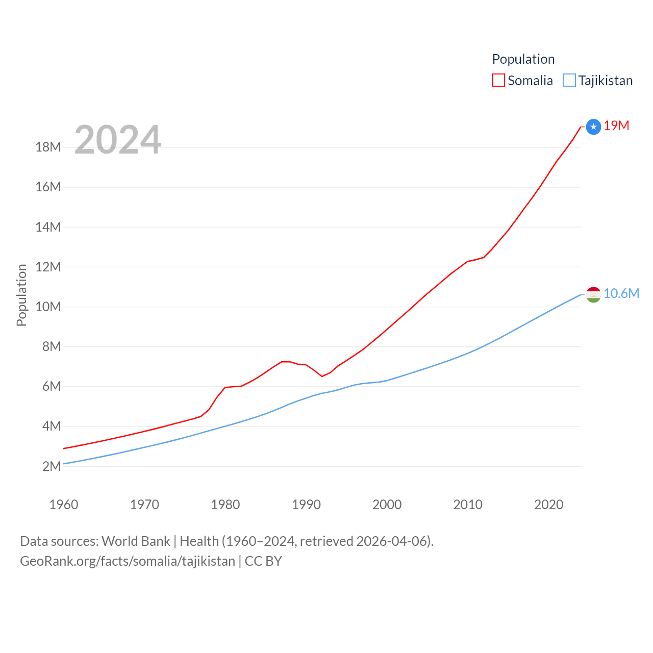 Somalia has a population of 19M (ranked 68/197), compared with 10.6M in Tajikistan (ranked 91/197). Somalia's land area is 242,217 sq mi versus 53,587 sq mi for Tajikistan (ranked 42nd vs. 93rd).