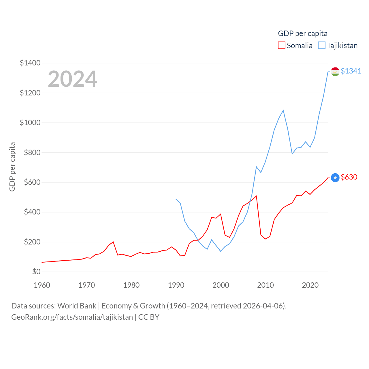 By GDP, Somalia ranks 150/197 ($12B) and Tajikistan ranks 145/197 ($14.2B). By GDP per capita, Somalia ranks 192/197 ($630), while Tajikistan ranks 166/197 ($1,341).