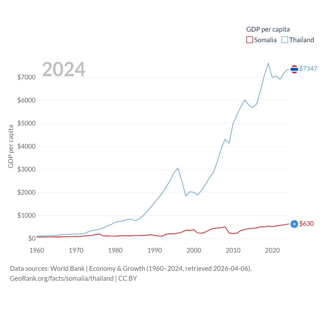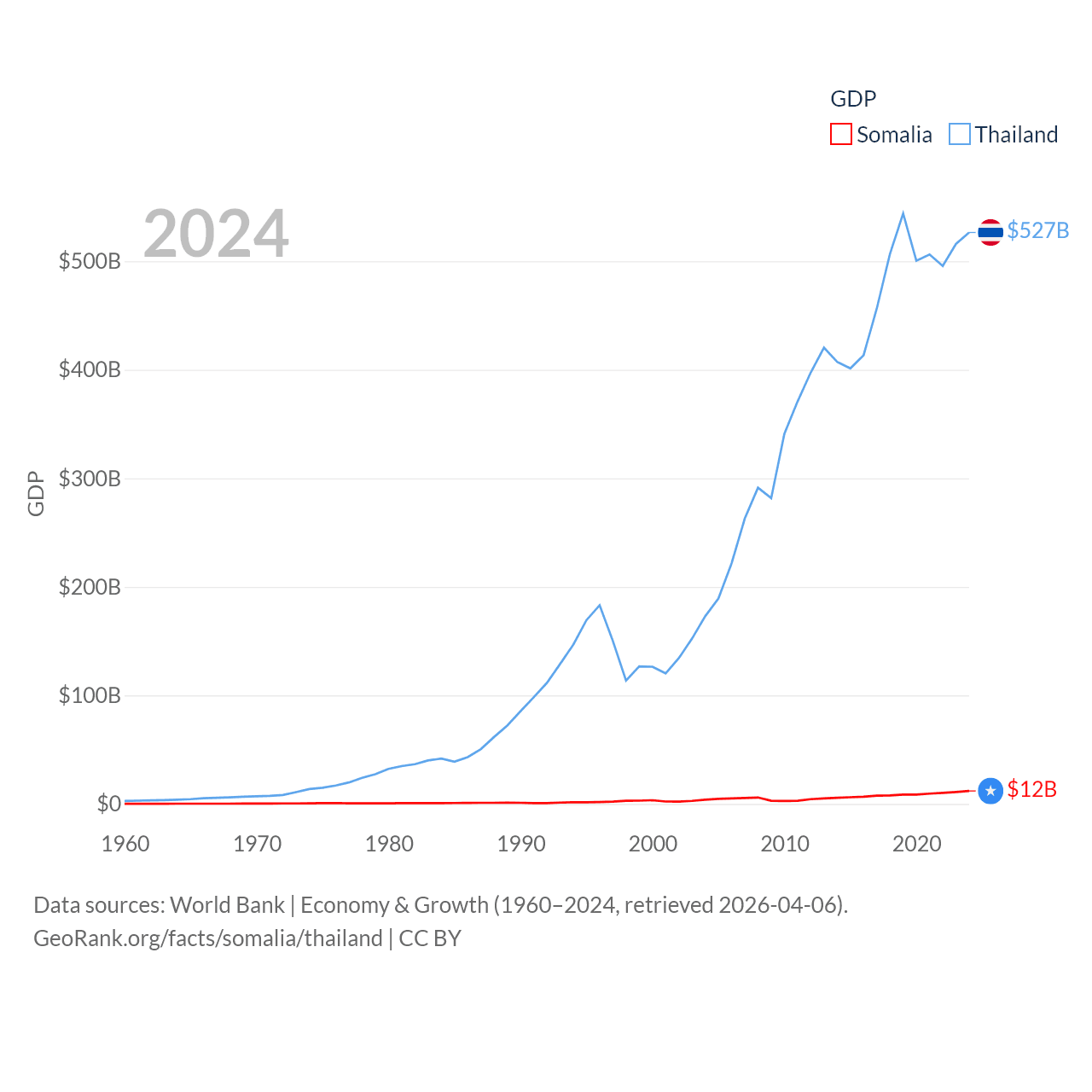 By GDP, Somalia ranks 150/197 ($12B) and Thailand ranks 31/197 ($527B). By GDP per capita, Somalia ranks 192/197 ($630), while Thailand ranks 100/197 ($7,347).