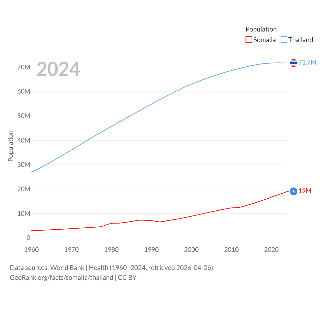 Somalia has a population of 19M (ranked 68/197), compared with 71.7M in Thailand (ranked 20/197). Somalia's land area is 242,217 sq mi versus 197,256 sq mi for Thailand (ranked 42nd vs. 50th).