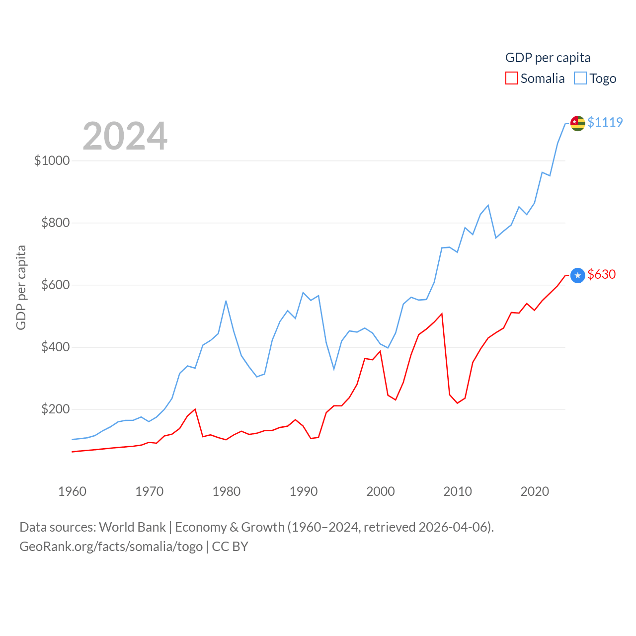 By GDP, Somalia ranks 150/197 ($12B) and Togo ranks 154/197 ($10.7B). By GDP per capita, Somalia ranks 192/197 ($630), while Togo ranks 172/197 ($1,119).