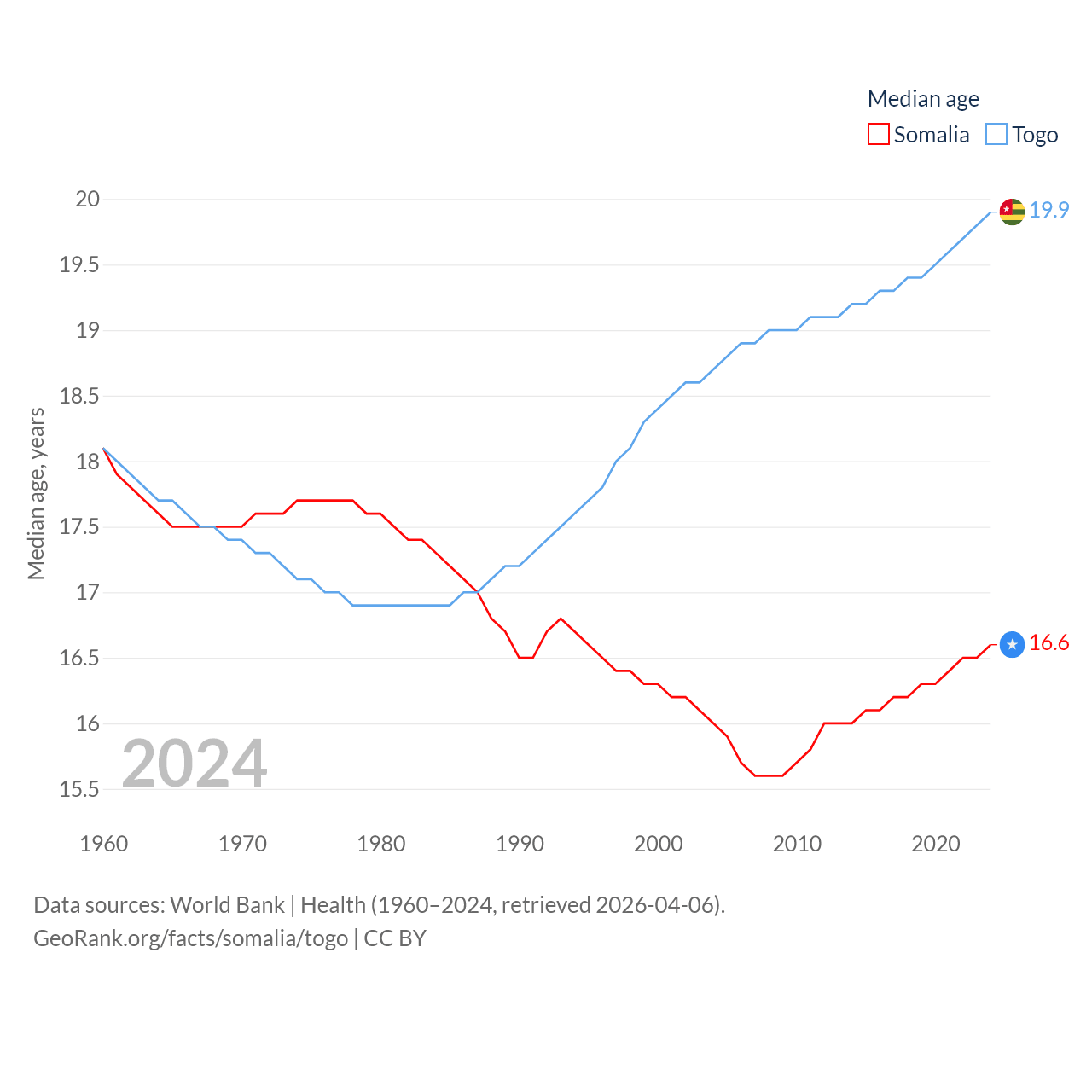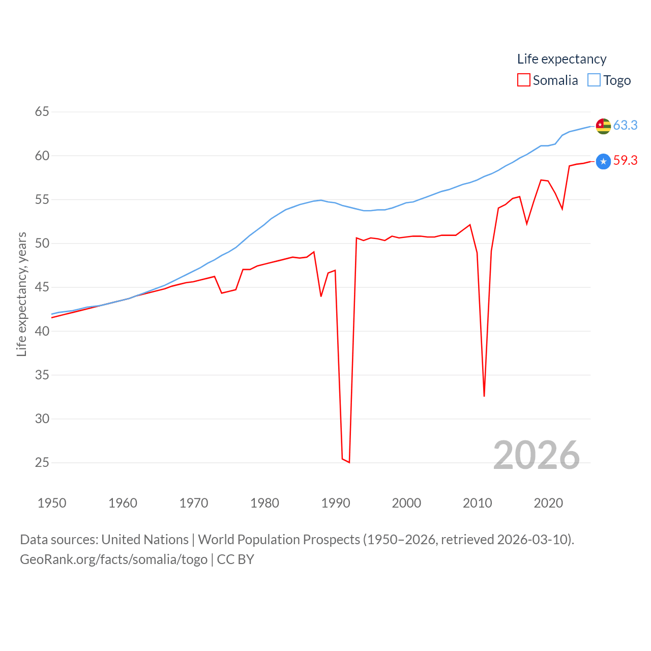 Somalia has a population of 19M (ranked 68/197), compared with 9.52M in Togo (ranked 98/197). Somalia's land area is 242,217 sq mi versus 21,000 sq mi for Togo (ranked 42nd vs. 124th).