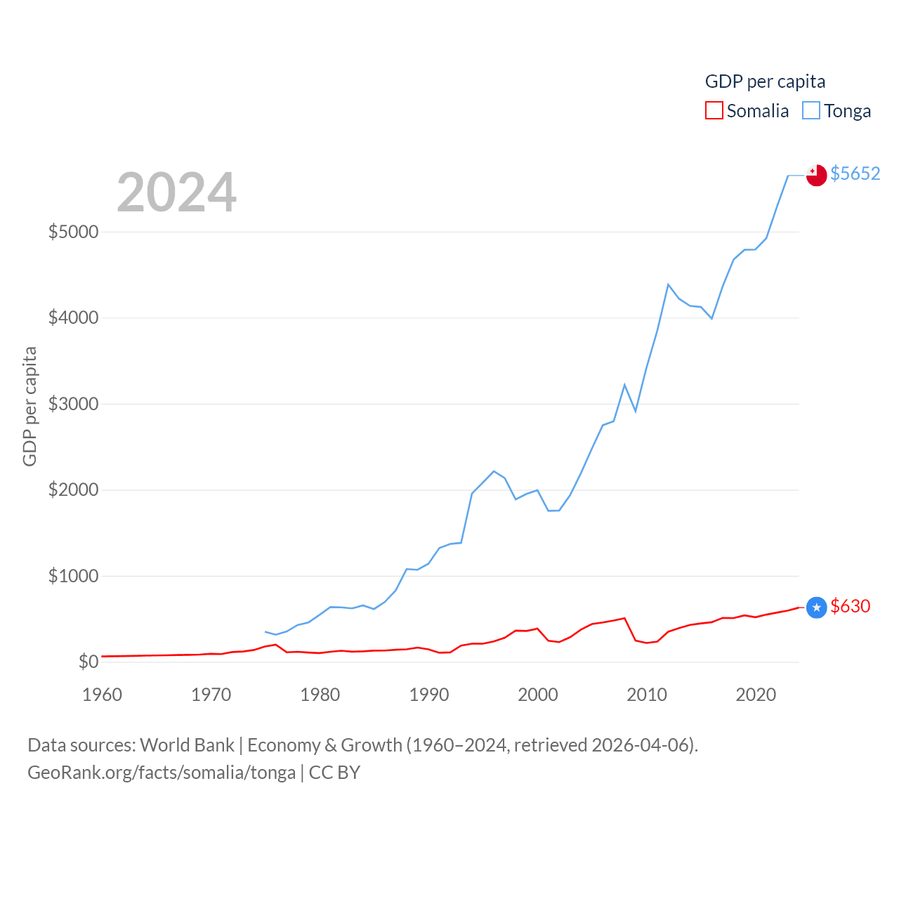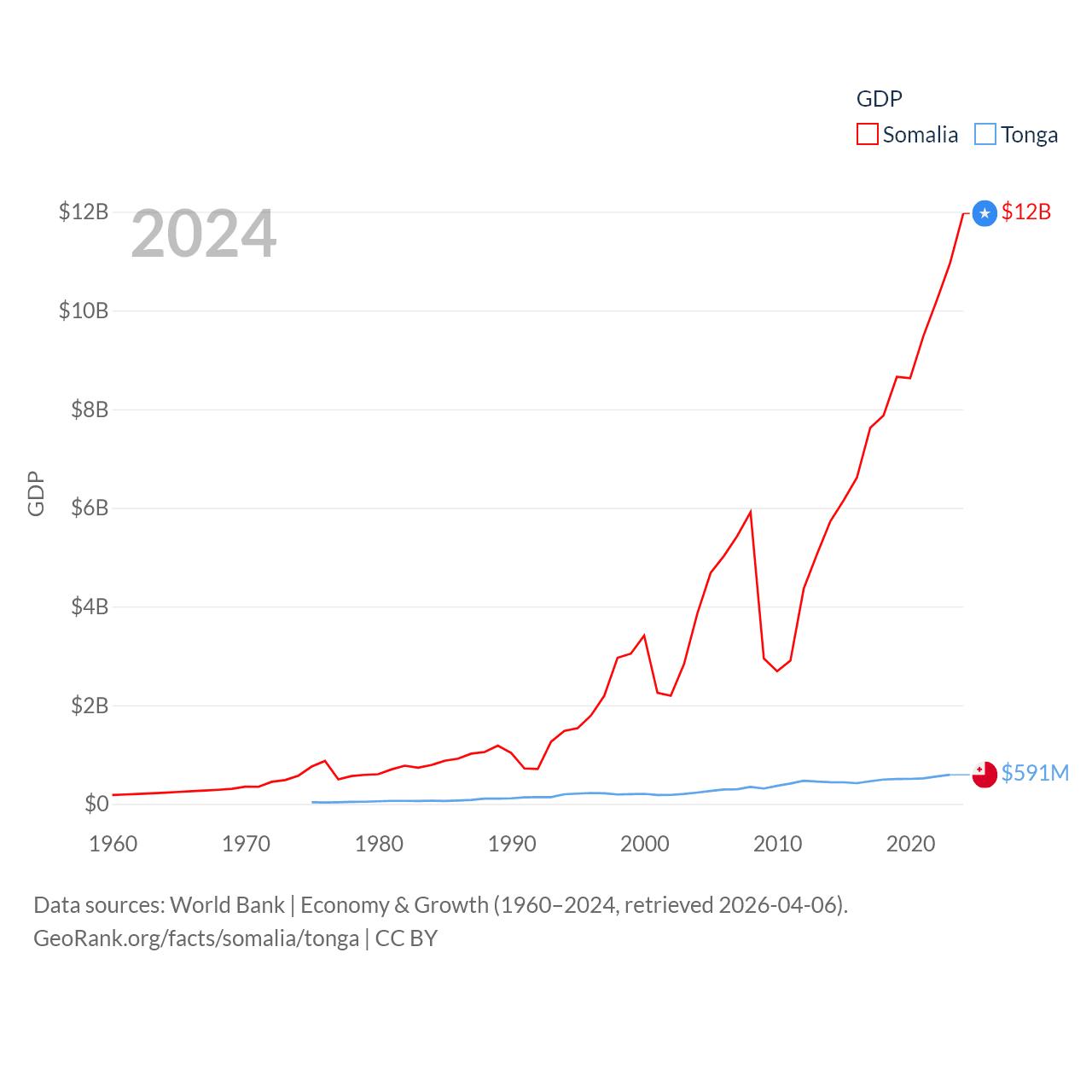 By GDP, Somalia ranks 150/197 ($12B) and Tonga ranks 191/197 ($591M). By GDP per capita, Somalia ranks 192/197 ($630), while Tonga ranks 115/197 ($5,652).