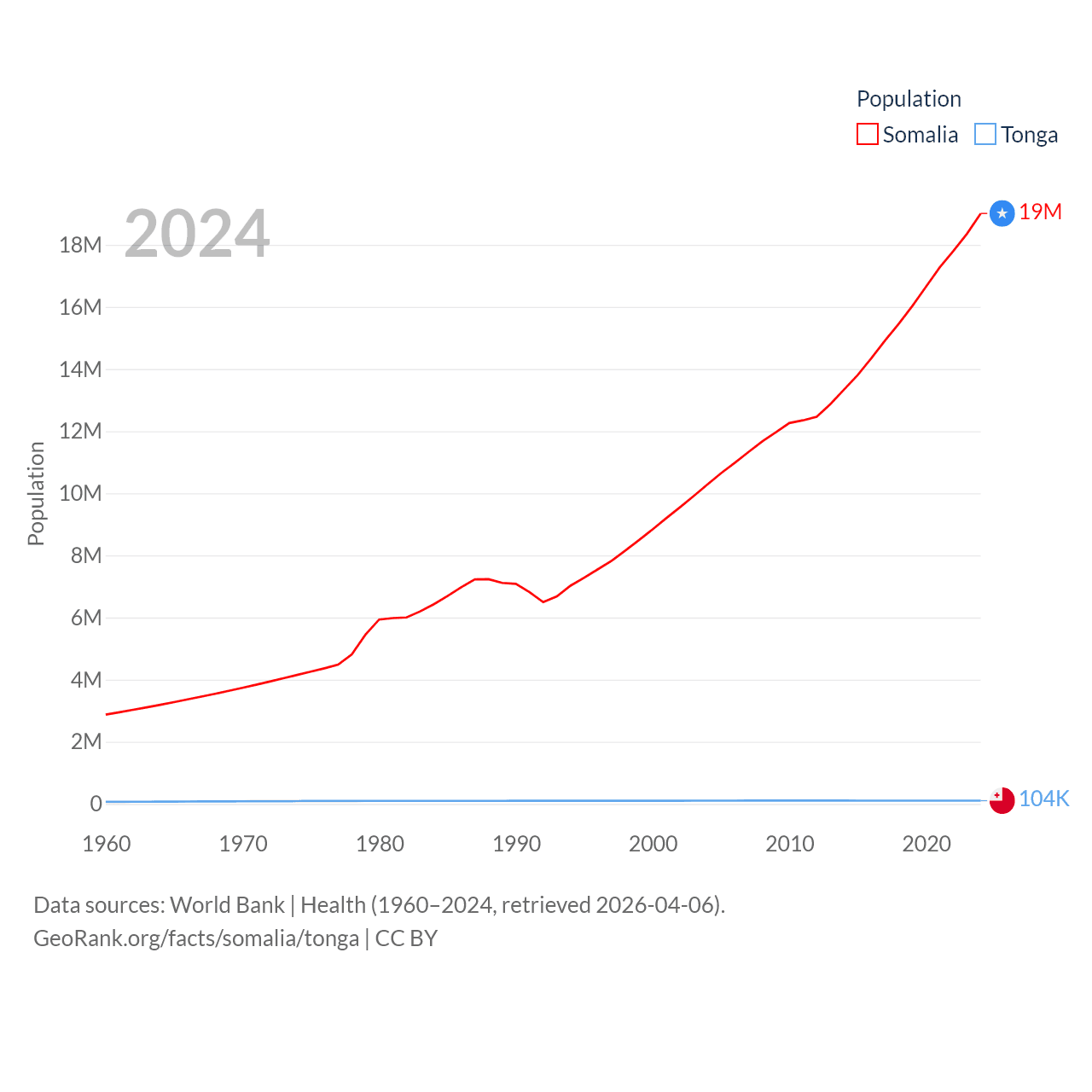 Somalia has a population of 19M (ranked 68/197), compared with 104K in Tonga (ranked 183/197). Somalia's land area is 242,217 sq mi versus 278 sq mi for Tonga (ranked 42nd vs. 176th).
