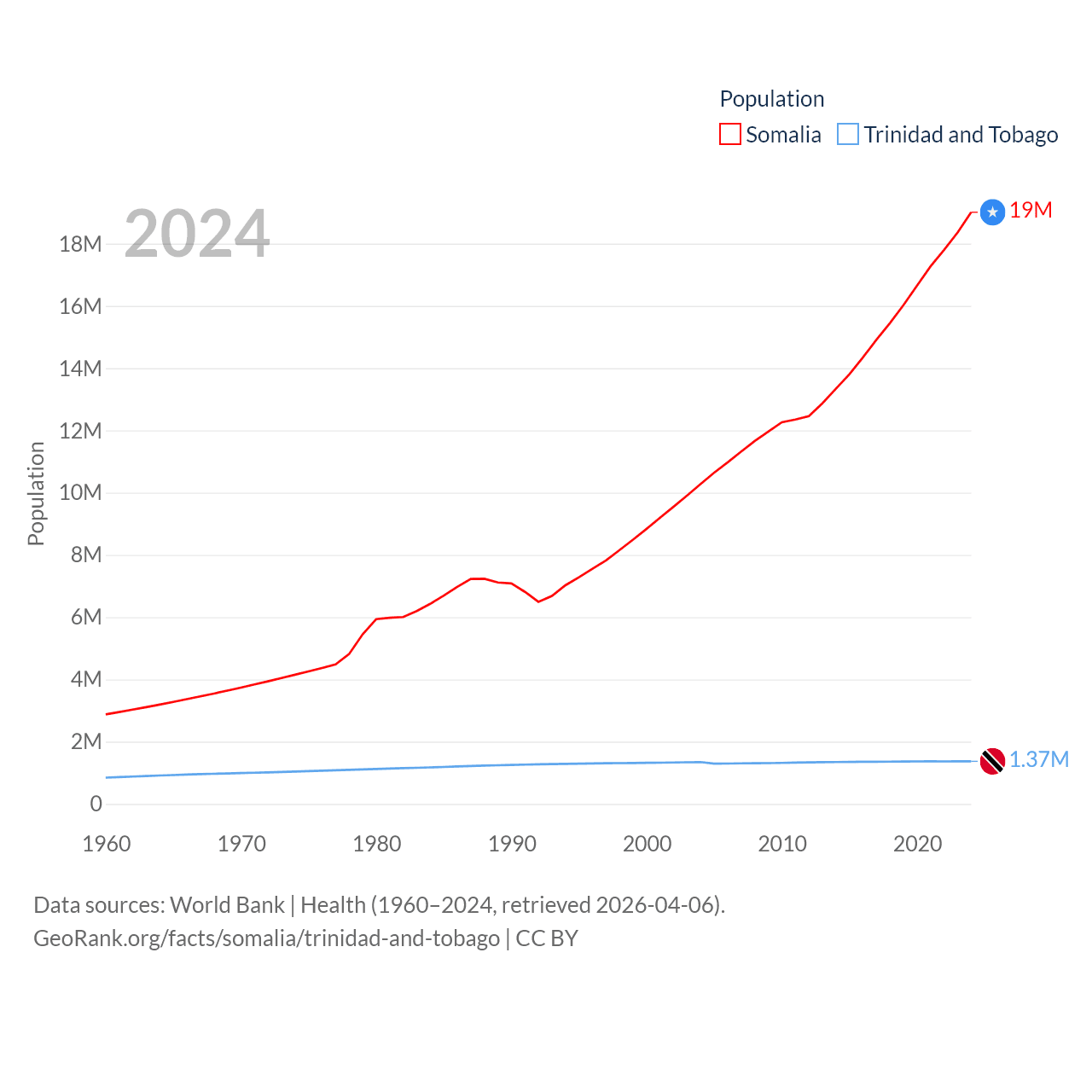Somalia has a population of 19M (ranked 68/197), compared with 1.37M in Trinidad and Tobago (ranked 154/197). Somalia's land area is 242,217 sq mi versus 1,981 sq mi for Trinidad and Tobago (ranked 42nd vs. 166th).