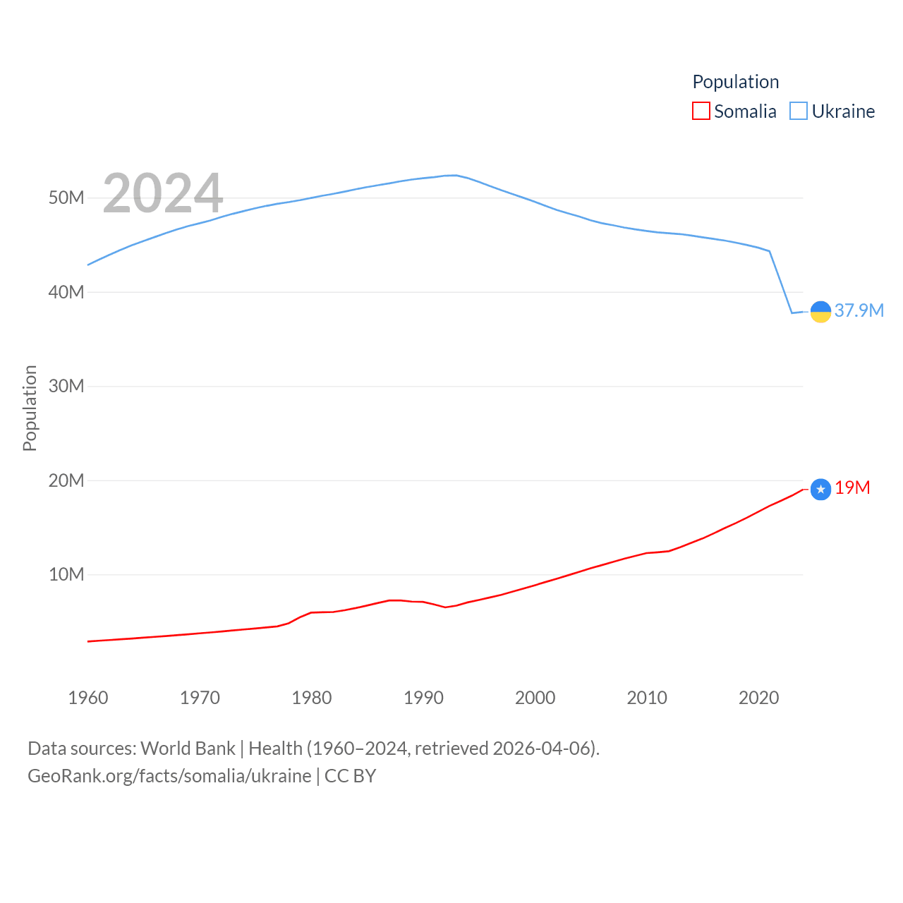 Somalia has a population of 19M (ranked 68/197), compared with 37.9M in Ukraine (ranked 41/197). Somalia's land area is 242,217 sq mi versus 223,708 sq mi for Ukraine (ranked 42nd vs. 46th).